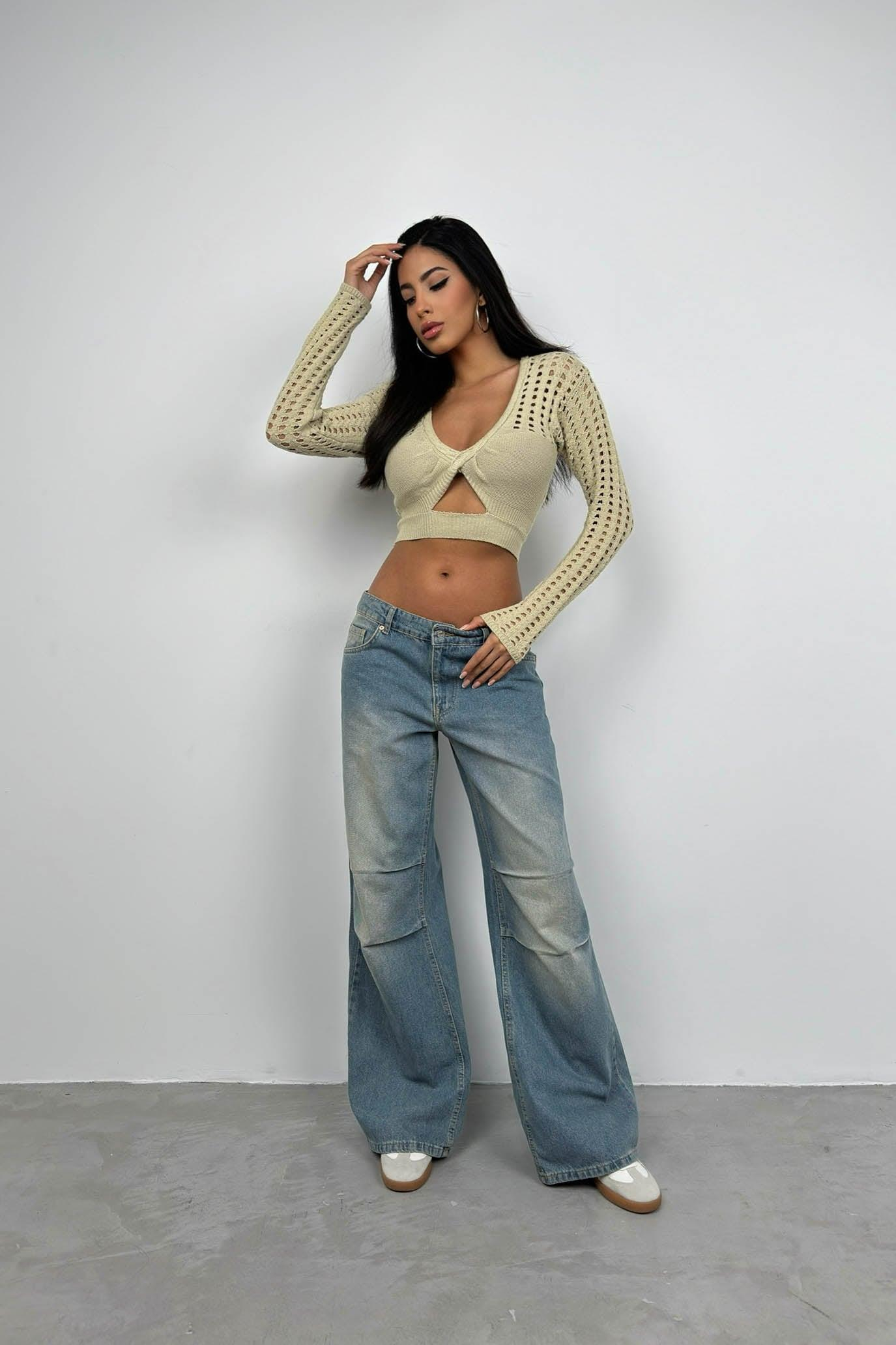 Ajurlu Bej Triko Crop Bluz