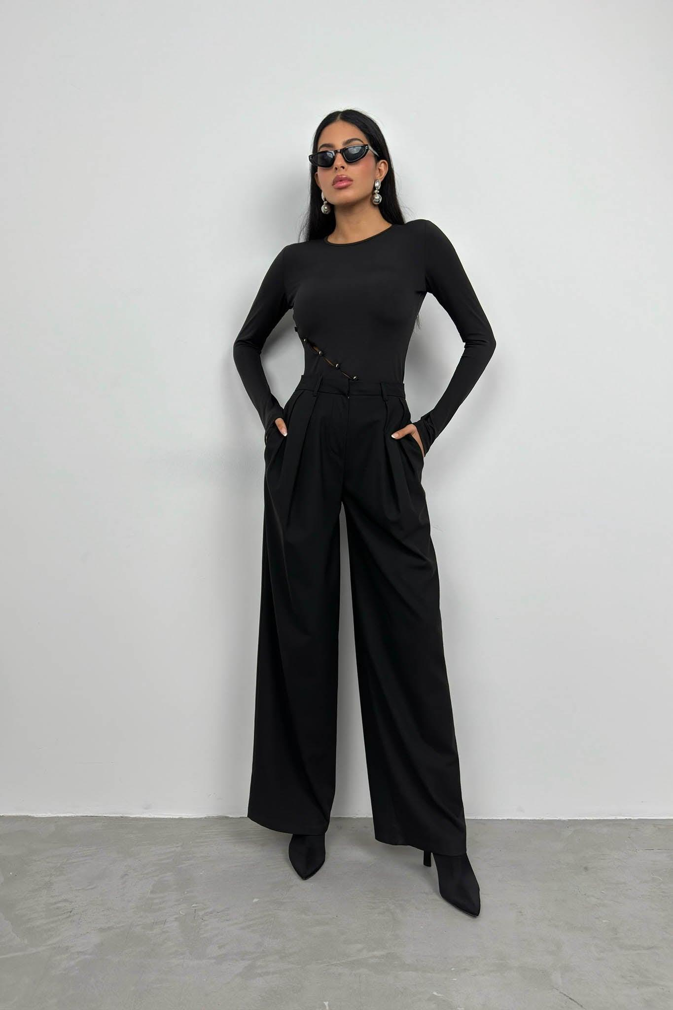 Asimetrik Düğme Detay Uzun Kollu Siyah Bluz