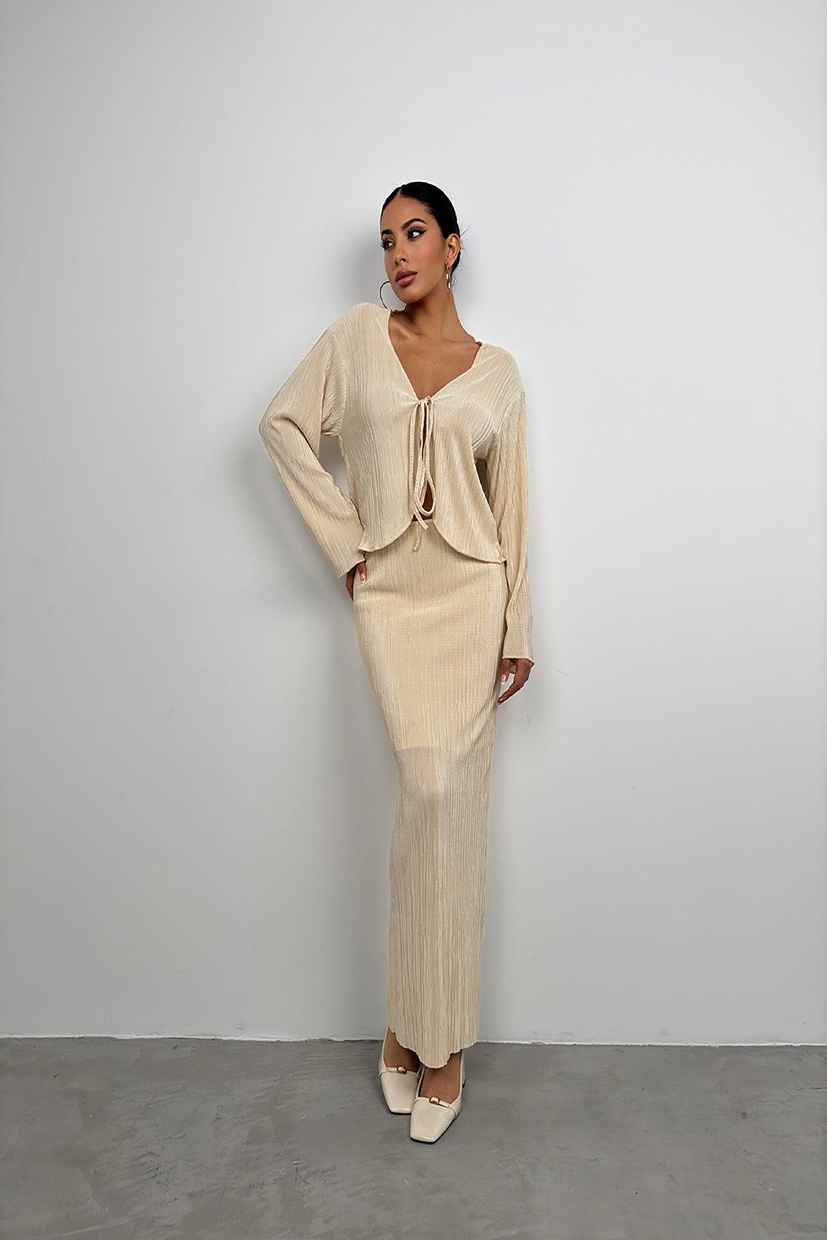 Bağlama Detay Dokulu Bej Bluz