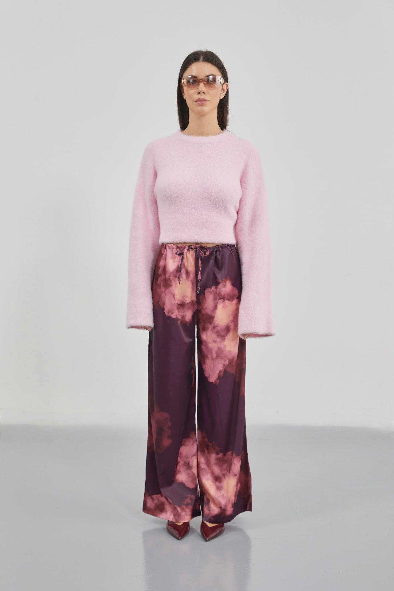 Bel Lastikli Desenli Saten Bordo Pantolon ()