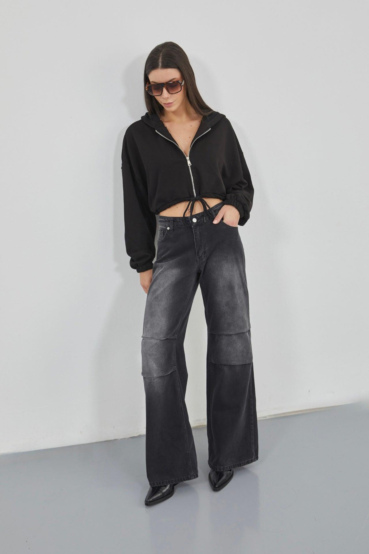 Beli Lastikli Fermuarlı Siyah Sweatshirt