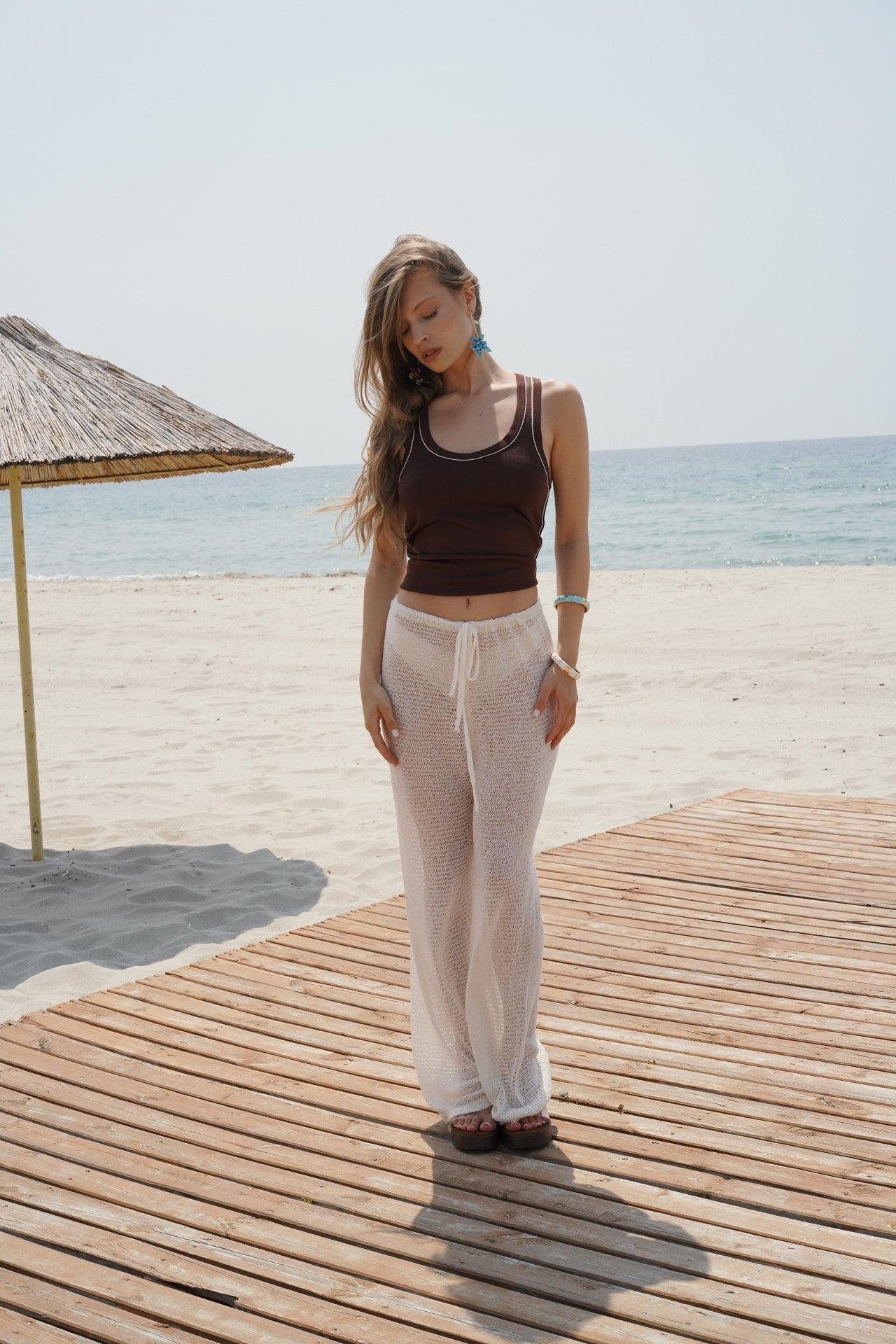 Biye Detay Halter Yaka Kahverengi Beyaz Bluz