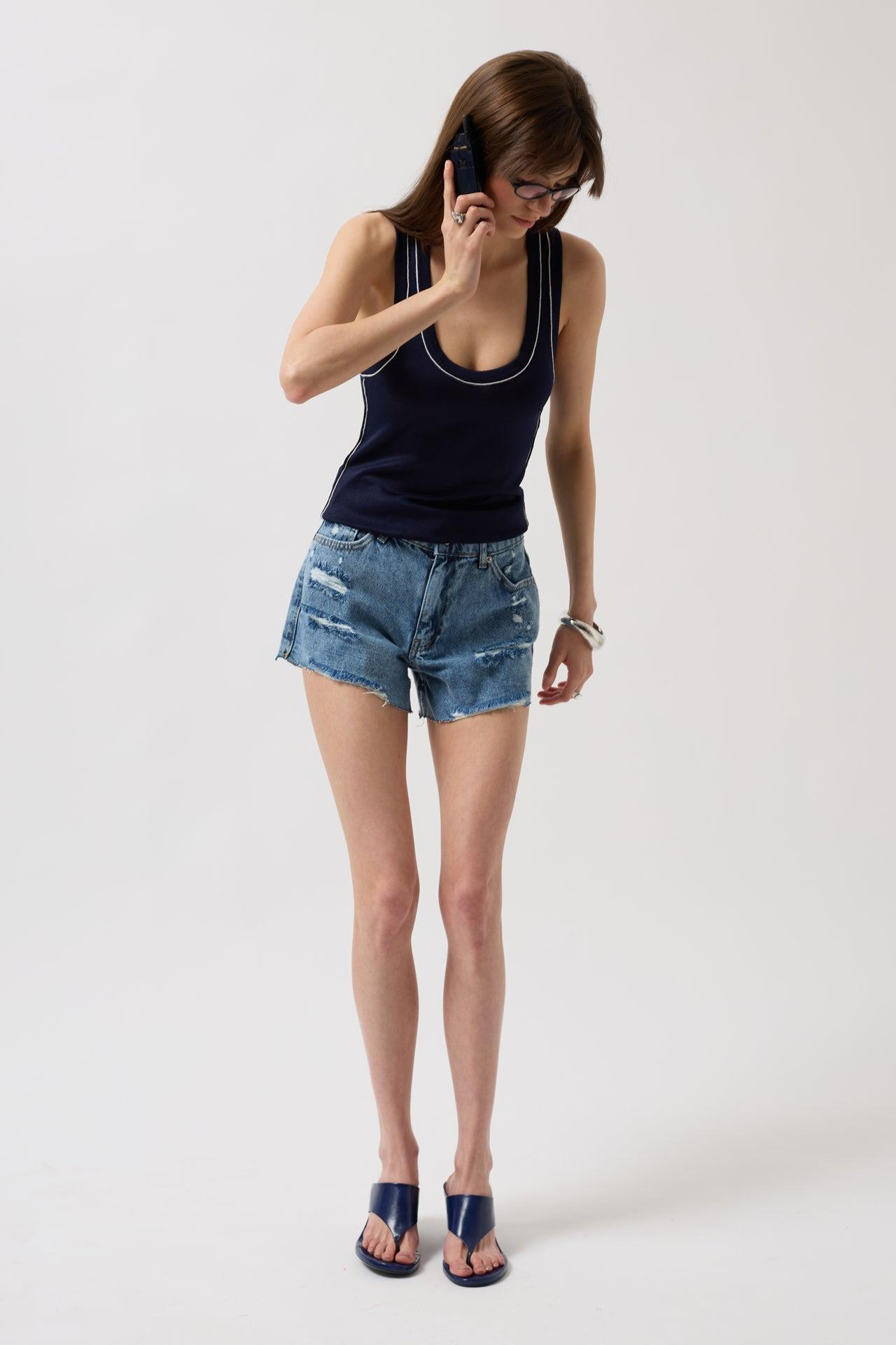 Biye Detay Halter Yaka Lacivert Beyaz Bluz