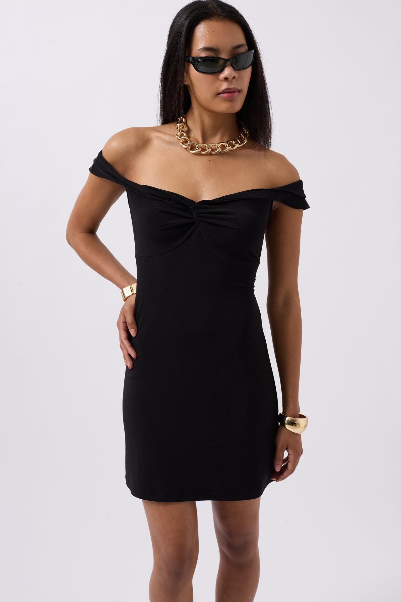 Büzgü Detay Omuz Askılı Mini Siyah Elbise ()