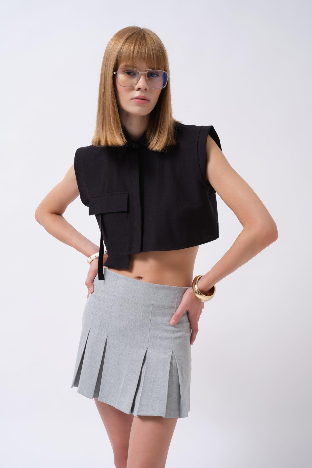 Cep Detay Kolsuz Keten Siyah Gömlek ()