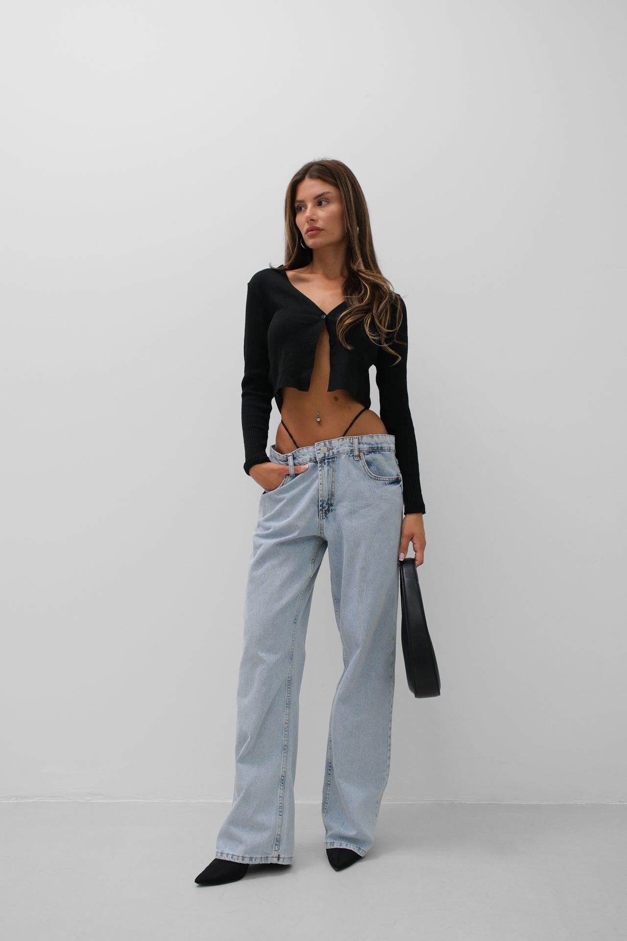 Çift Düğmeli V Yaka Siyah Triko Bluz ()
