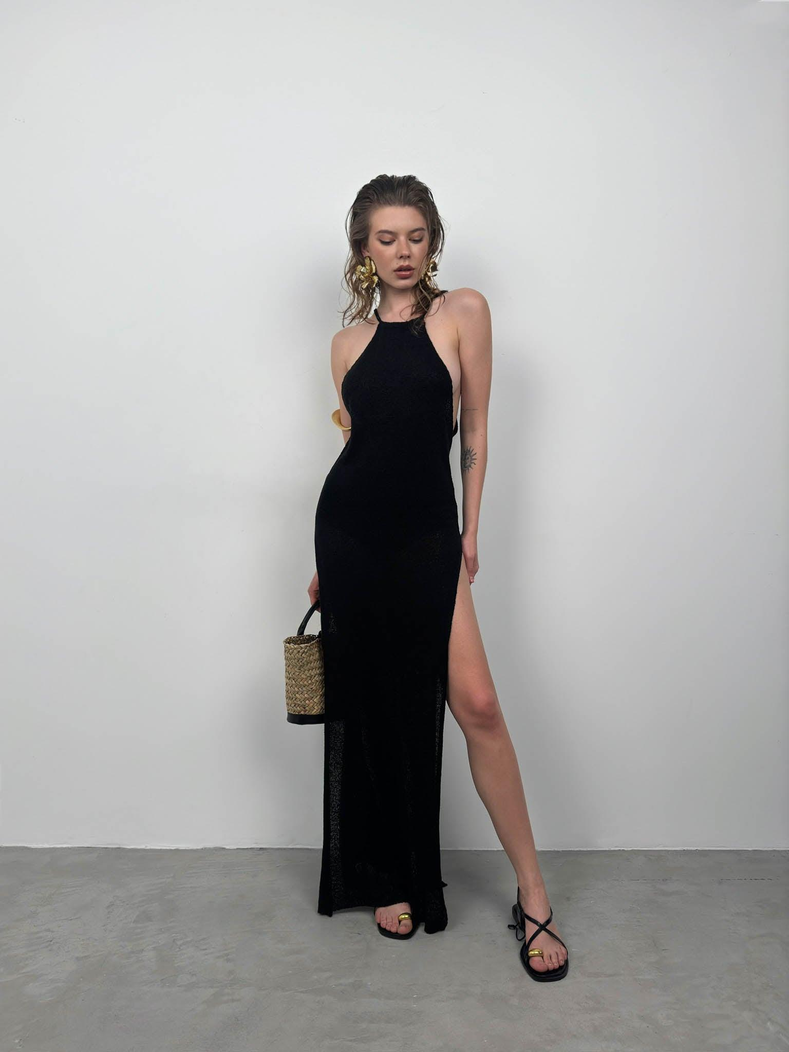 Çift Yırtmaçlı Dokulu Siyah Maxi Pareo