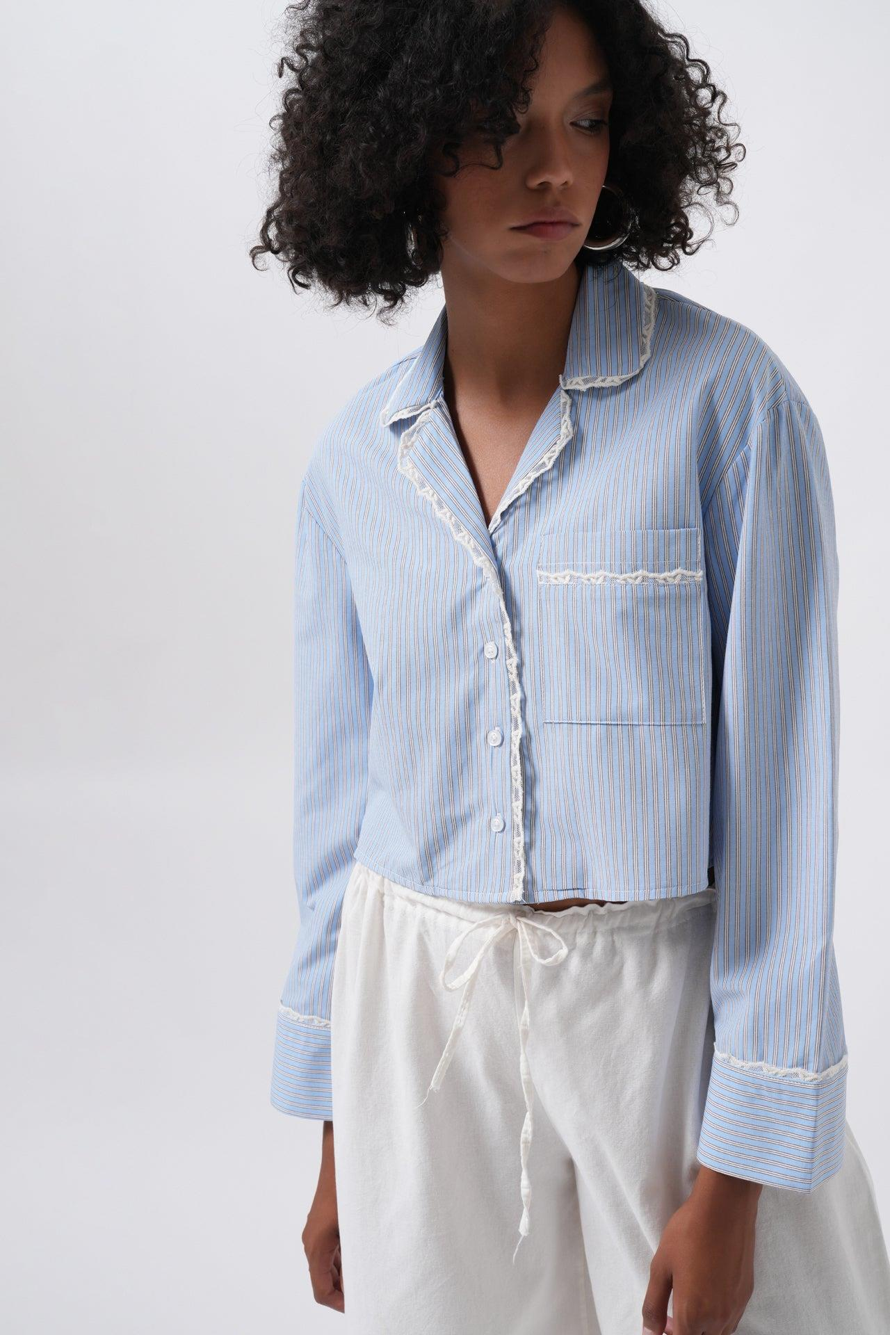 Çizgili Cep Detay Crop Mavi Gömlek ()