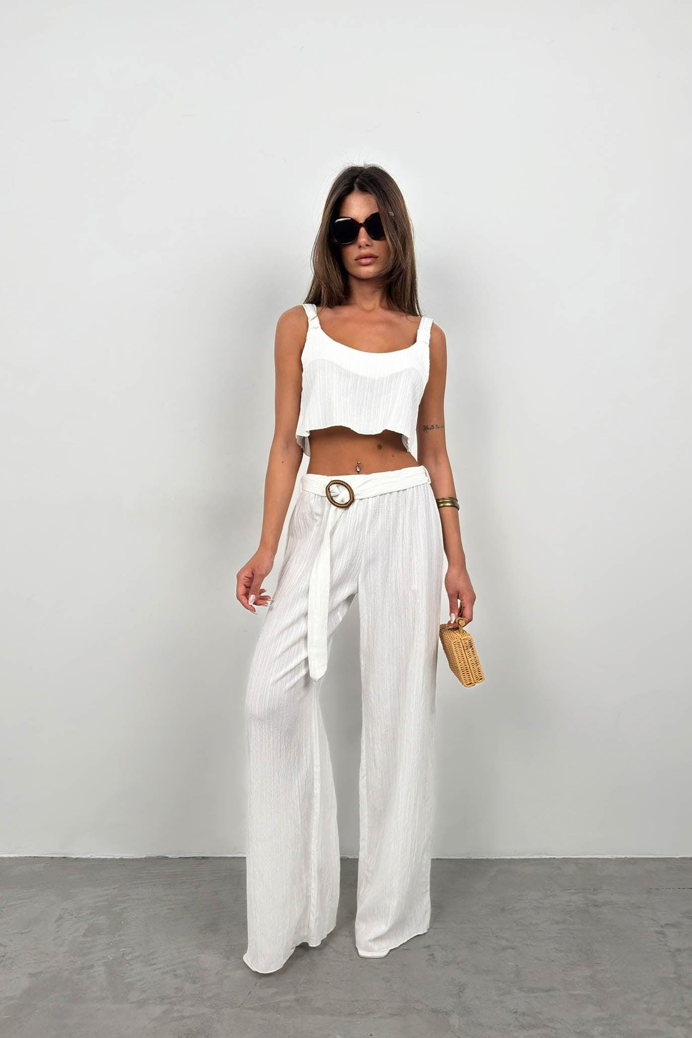 Crop Bluz Kemerli Beyaz Pantolon Takım ()