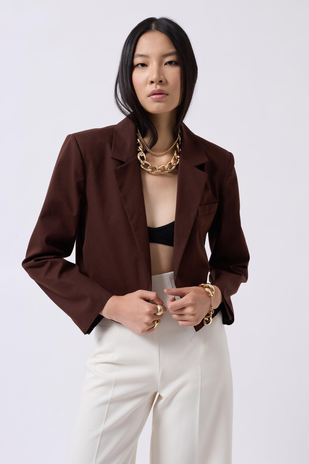 Crop Keten Blazer Kahverengi Ceket ()