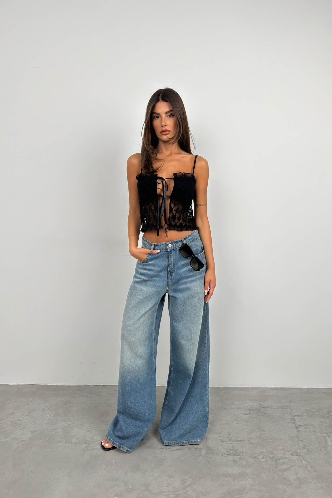 Dantelli Bağcık Detay Siyah Crop