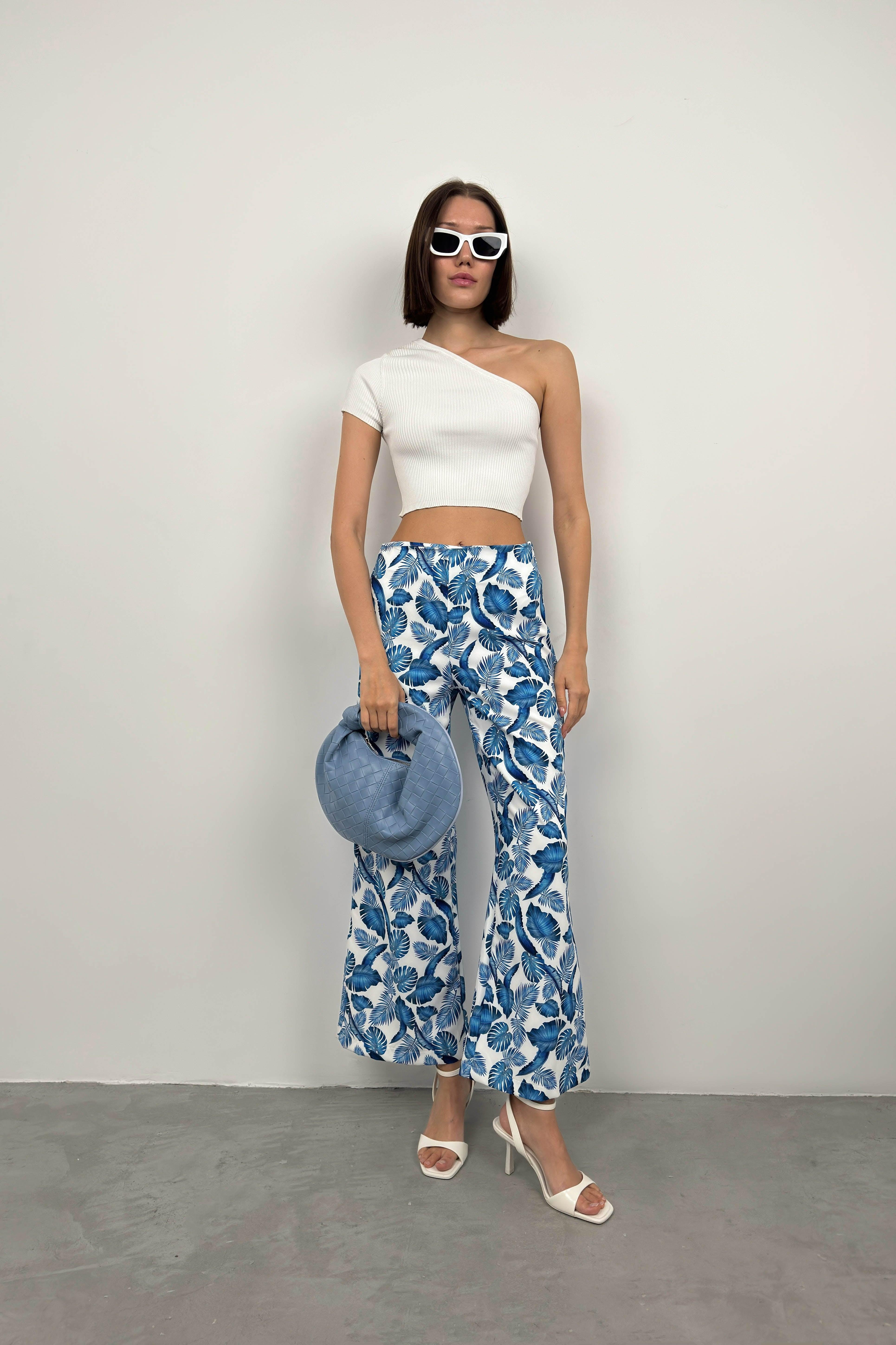 Desenli Boru Paça Mavi Pantolon