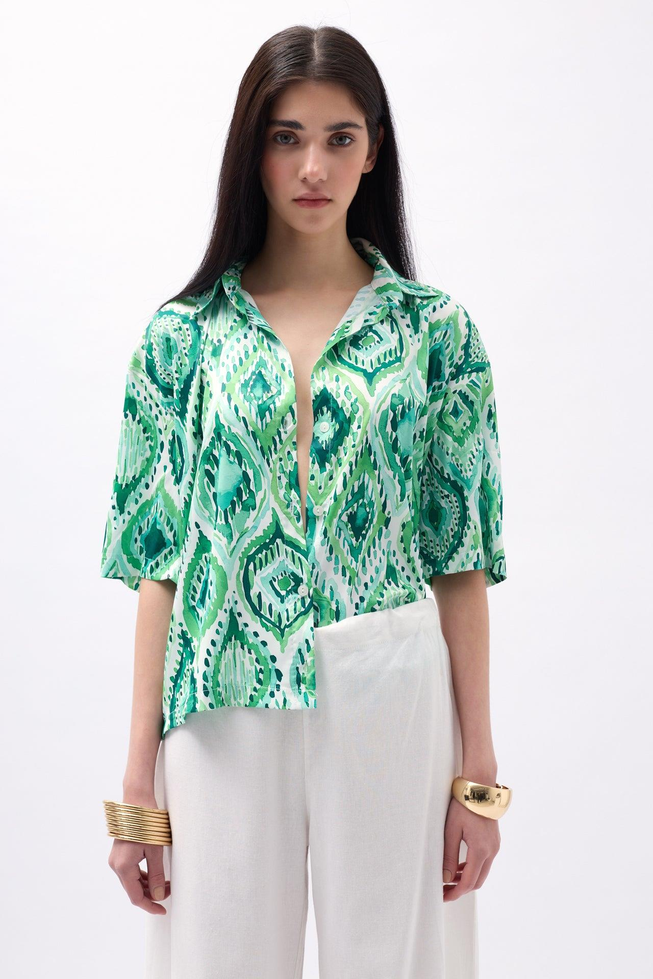 Desenli, Kısa Kollu, Önü Düğmeli, Ceket Yaka, Normal Boy, Saten Gömlek Manken Ölçüleri : Göğüs : 89 cm Bel : 68 cm Basen : 95 cm Manken Boy : 177 cm Kilo : 57 kg Manken üzerindeki M bedendir. Ürün İçeriği : 100 Polyester Ürün Kodu : 24S18031