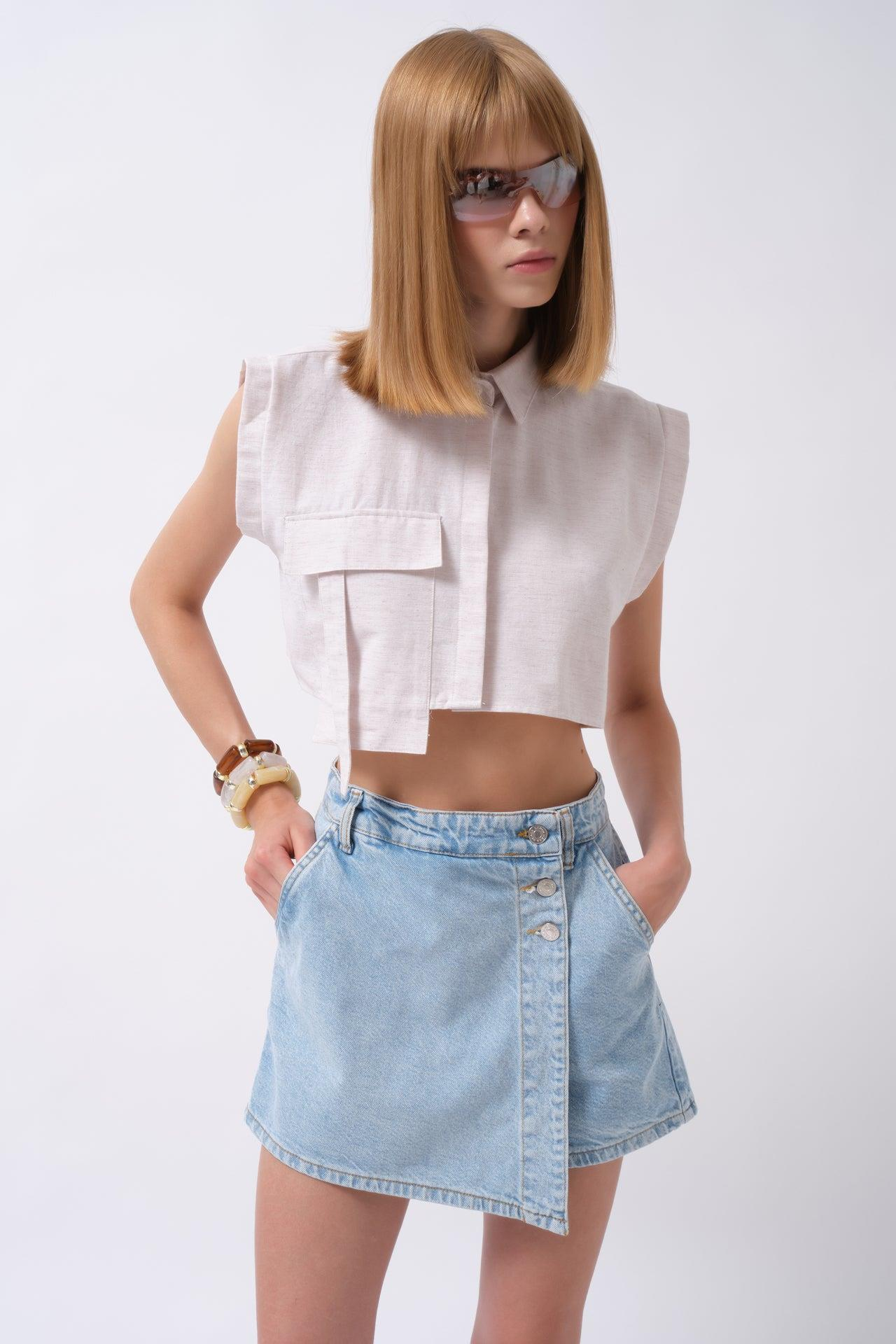 Düğme Detay Denim Mini Mavi Etek