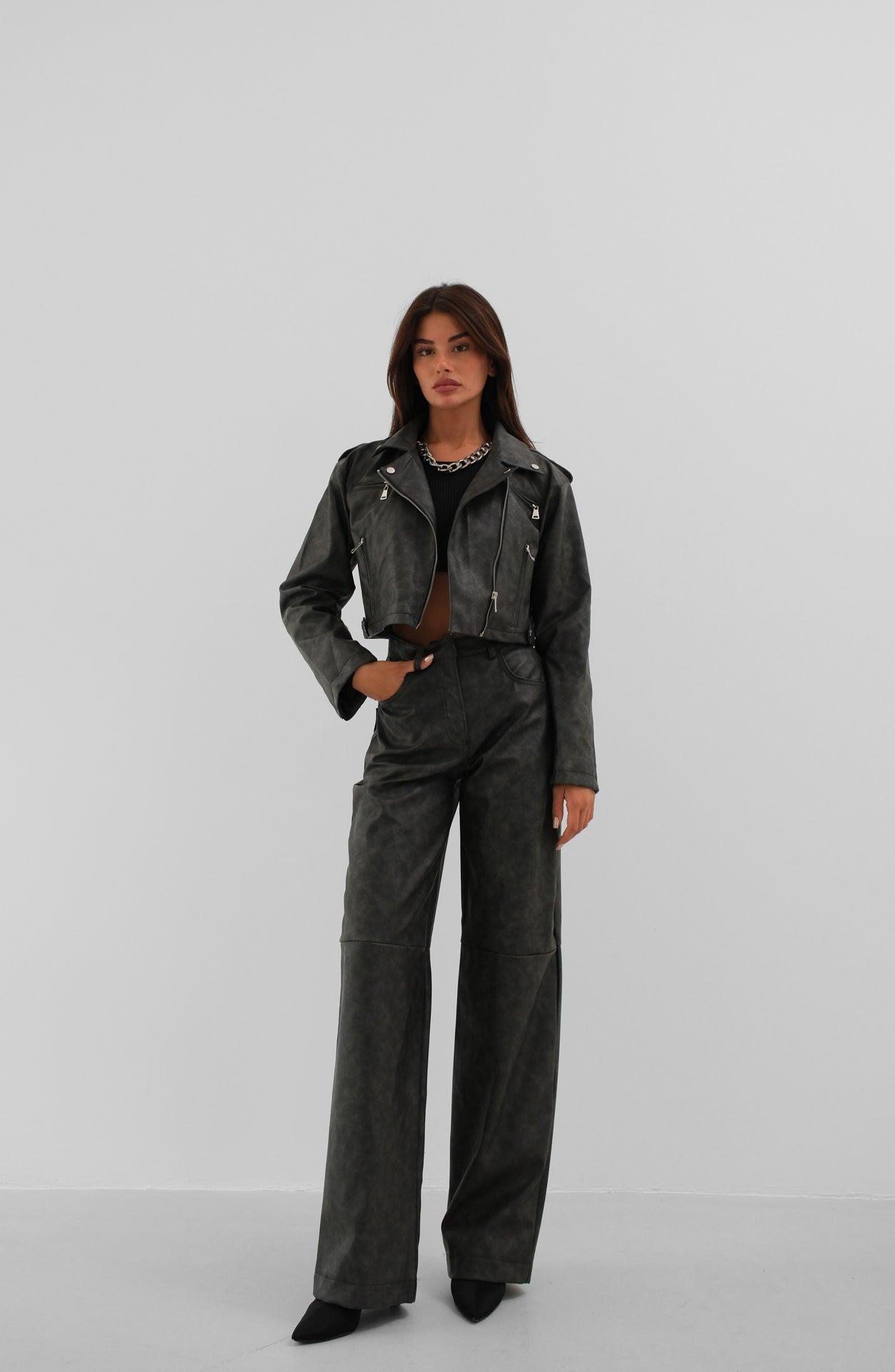 Eskitme Efektli Gri Crop Deri Ceket ()