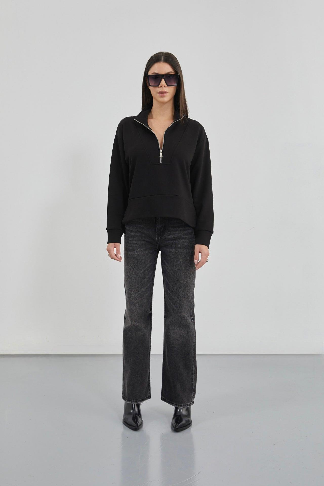 Fermuar ve Dikiş Detaylı Siyah Sweatshirt