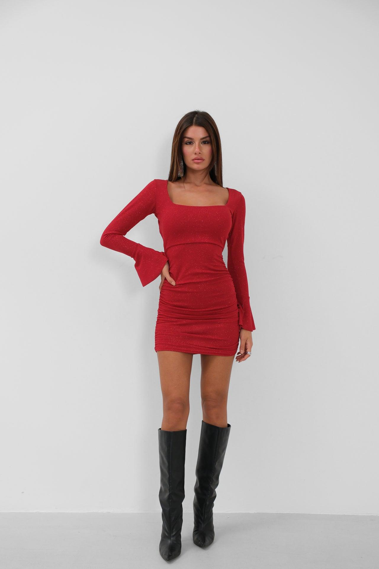 Göğüs Ve Sırt Dekolteli Simli Kırmızı Elbise
