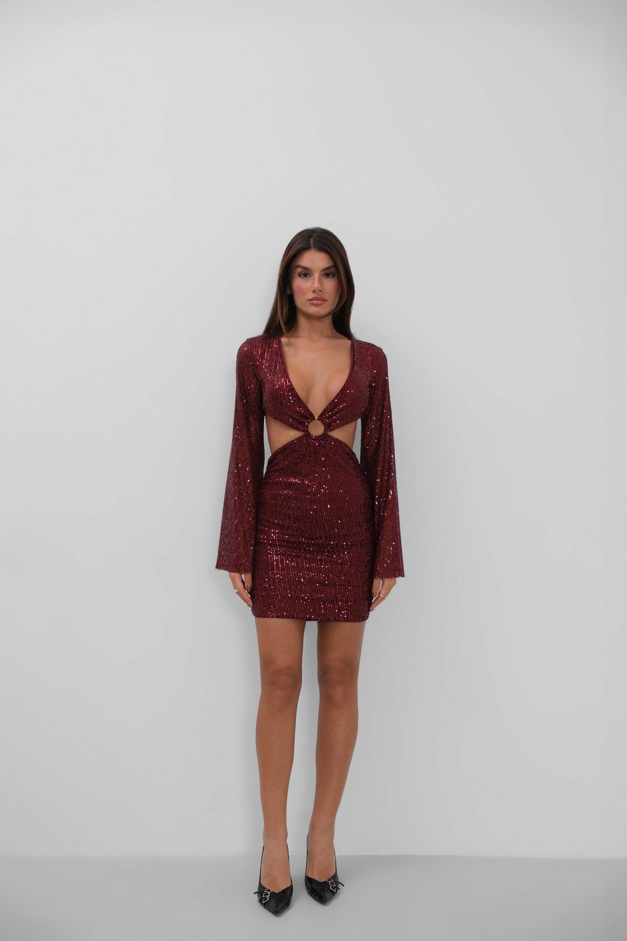 Halka Detay Yarasa Kol Payetli Mini Bordo Elbise ()