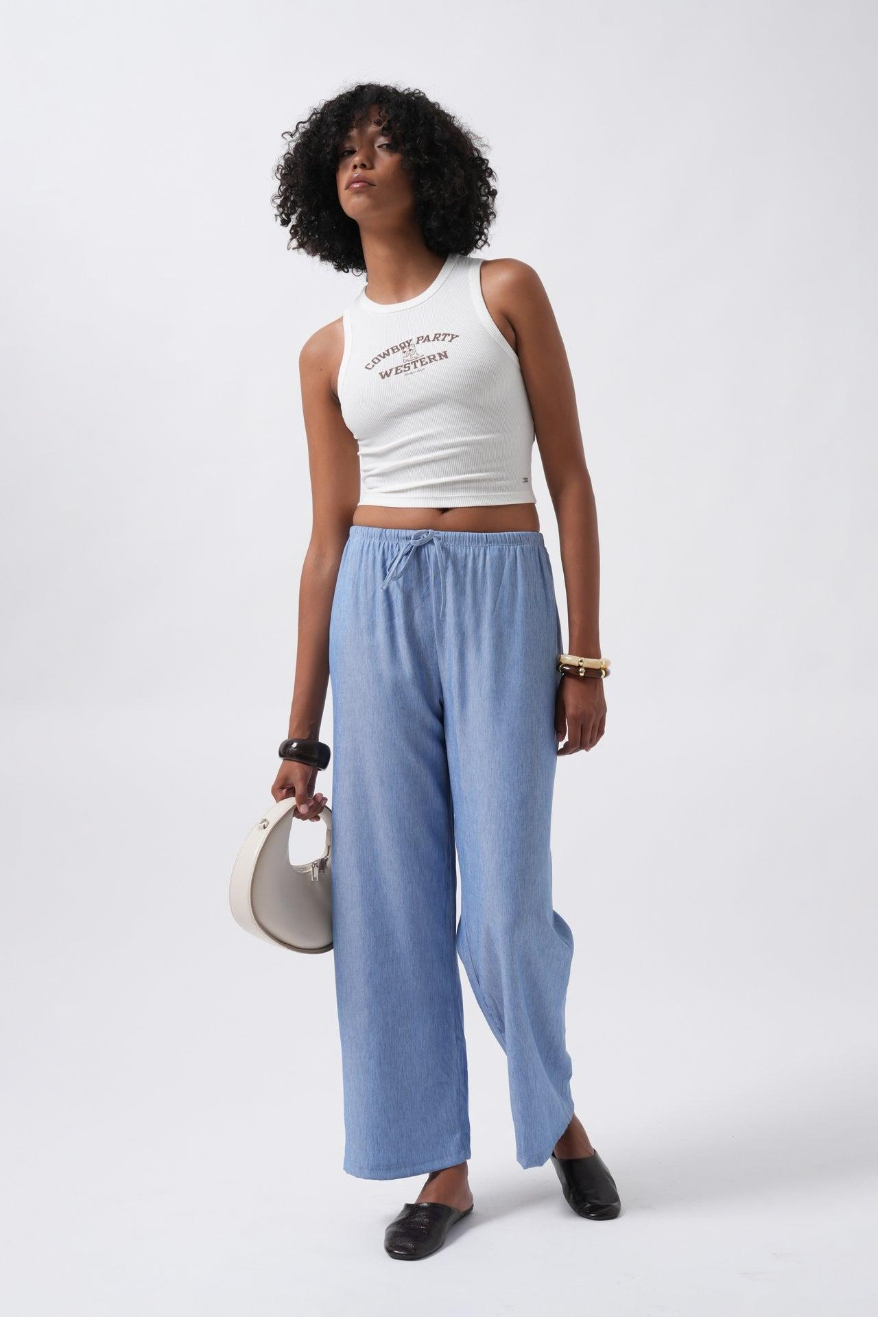İnce Kemerli Bağcık Detay Açık Mavi Pantolon