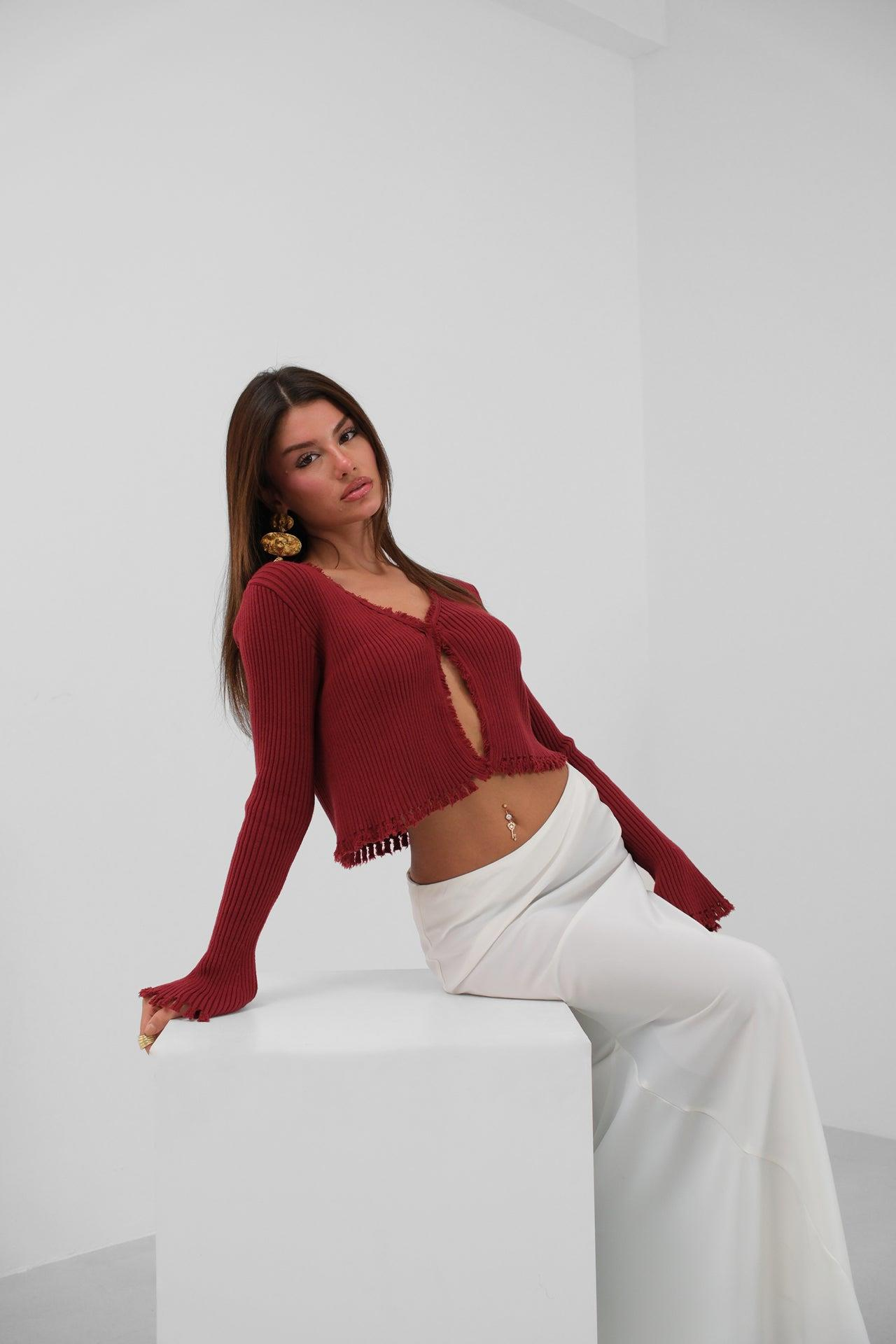 İspanyol Kol Yırtık Detay Bordo Hırka ()