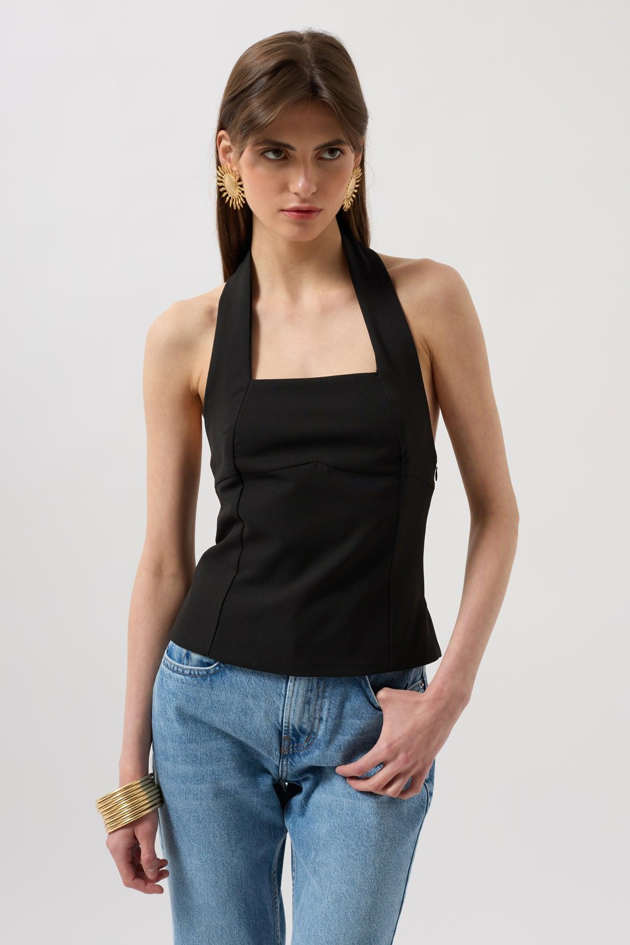 Kalın Askılı Crop Siyah Bluz