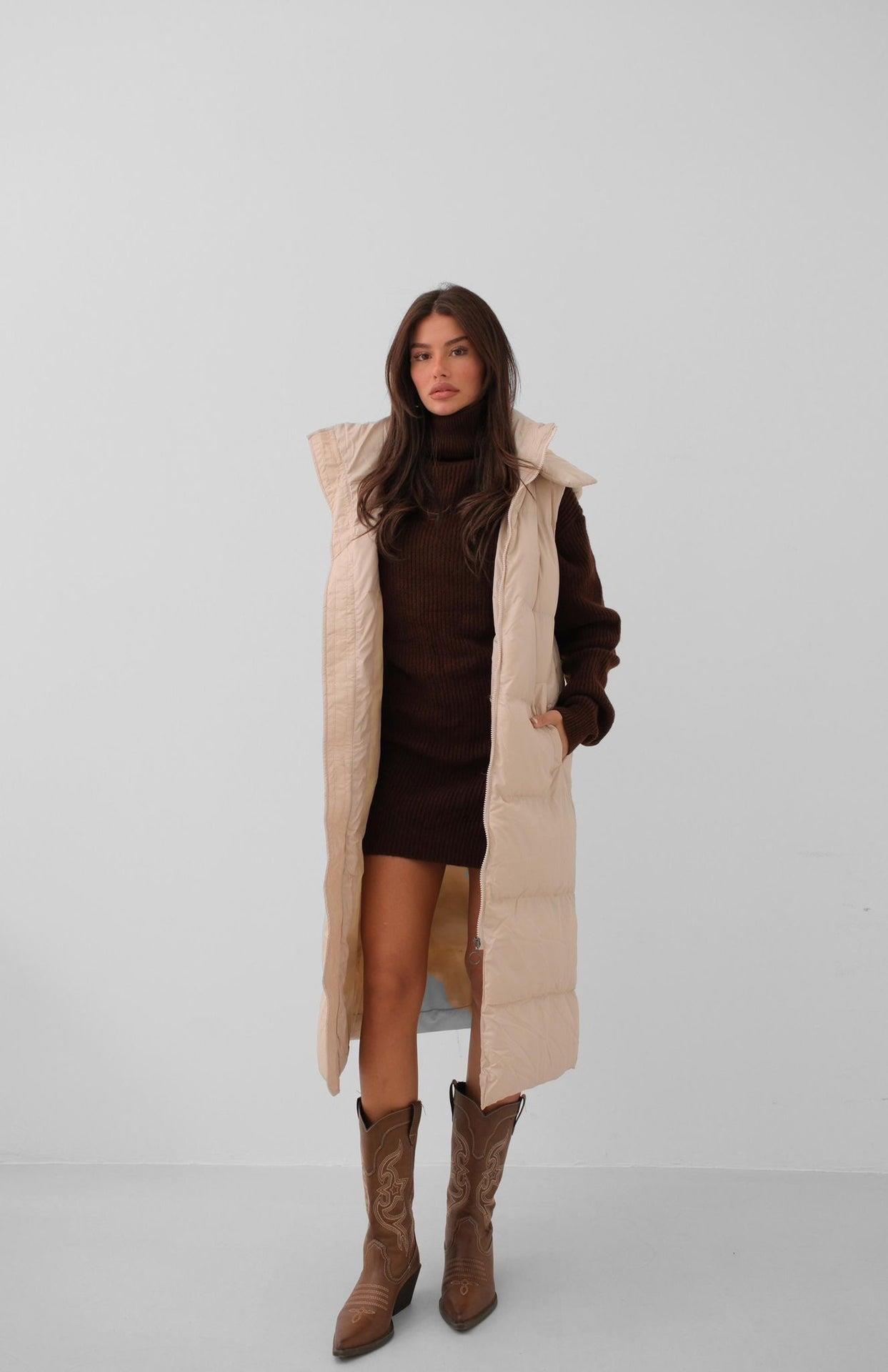 Kapüşonlu Şişme Bej Maxi Yelek ()