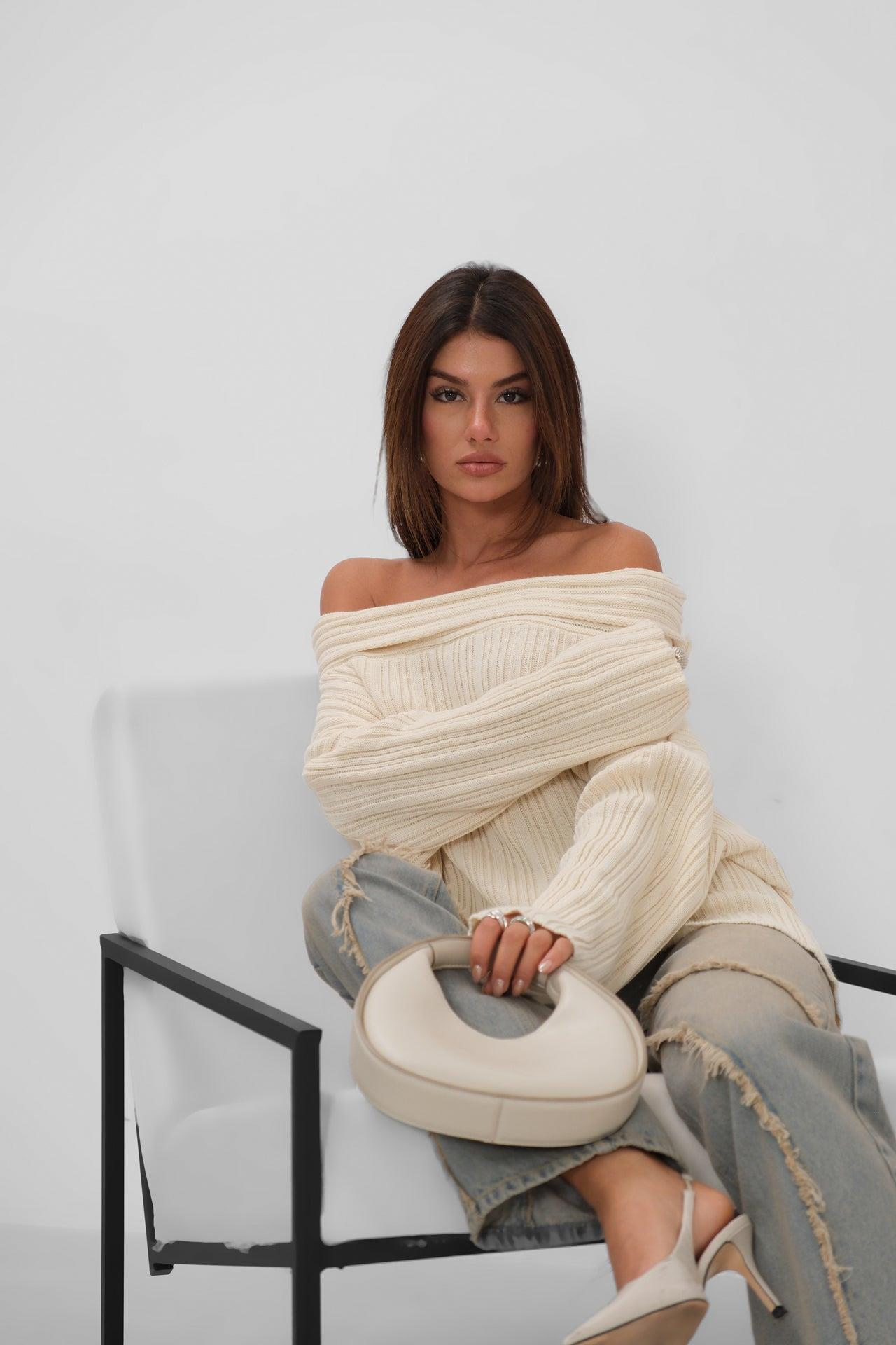 Kayık Yaka Fitilli Triko Bej Kazak ()
