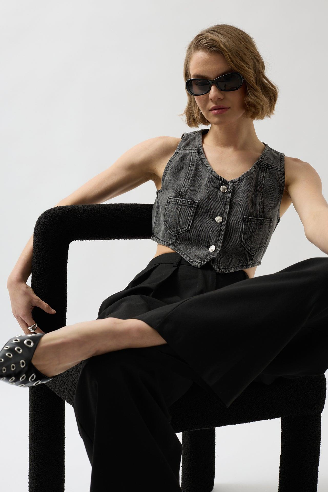 Cepli, Denim, Metal Düğmeli, Oval Kesim, Yelek Manken Ölçüleri : Göğüs : 85 cm Bel : 62 cm Basen : 91 cm Manken Boy : 173 cm Kilo : 50 kg Manken üzerindeki S bedendir. Ürün İçeriği : 100 Pamuk Ürün Kodu : 23W12001