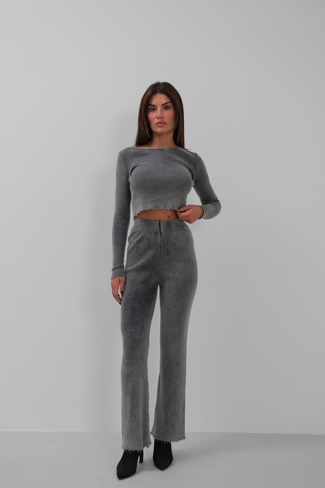 Lazer Detaylı Yıkamalı Triko Gri Takım ()