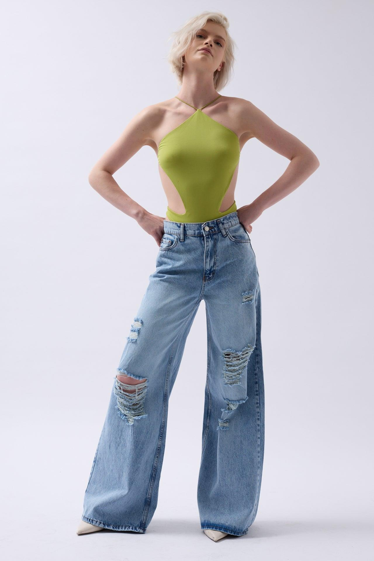 Lazer Kesim Geniş Paça Yüksek Bel Mavi Jean