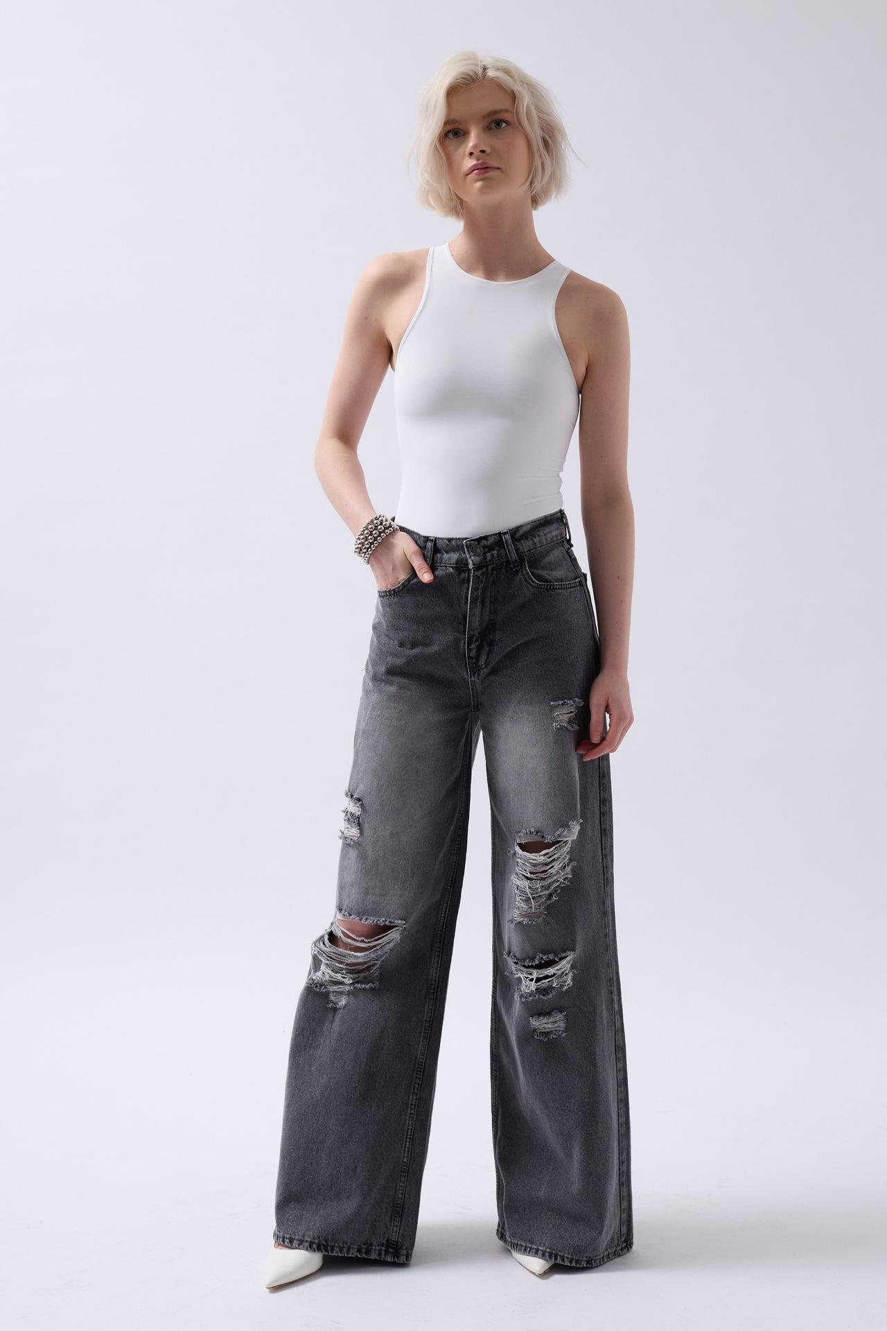 Lazer Kesim Geniş Paça Yüksek Bel Siyah Jean