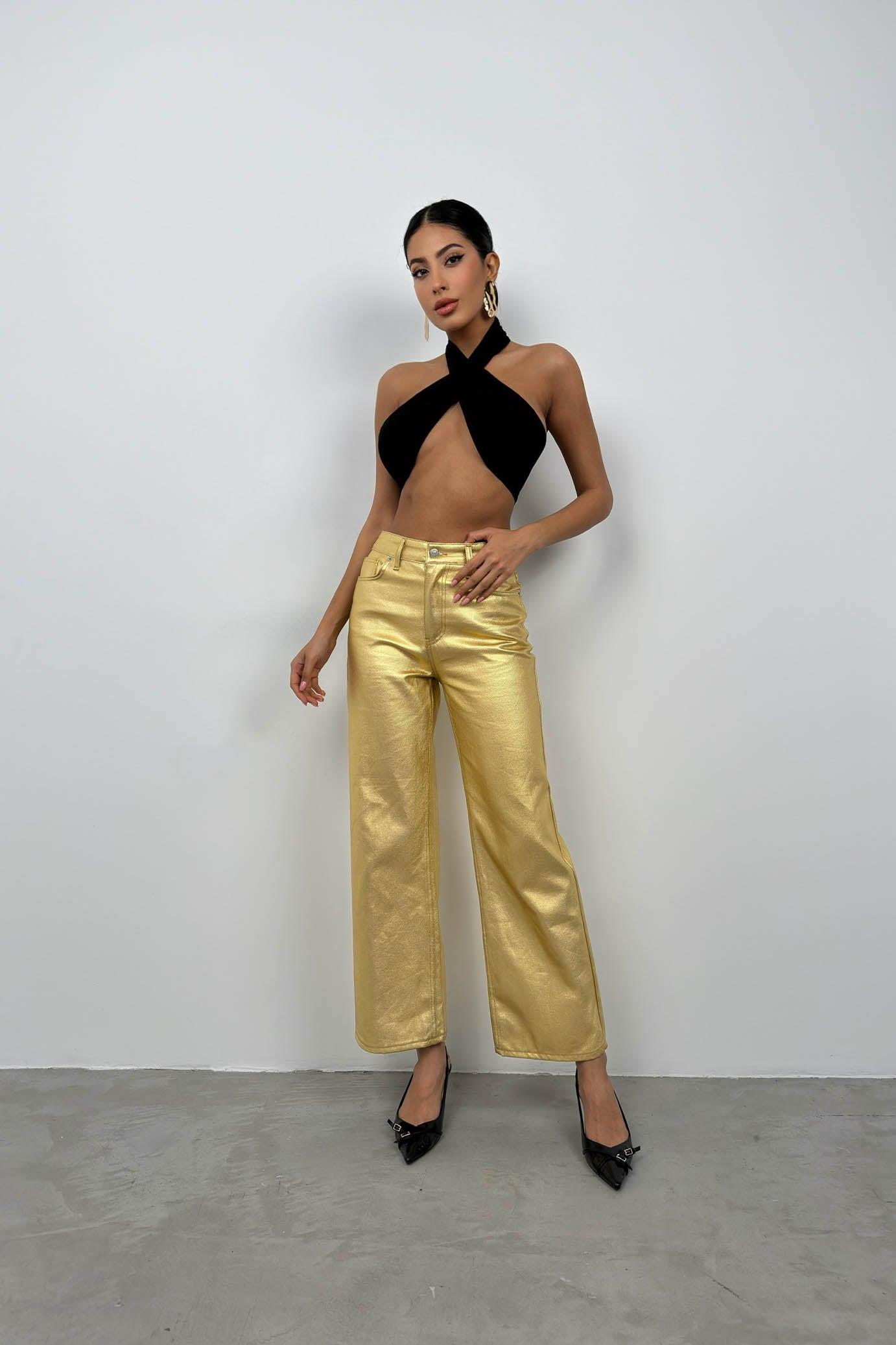 Metalik Gold Yüksek Bel Pantolon ()