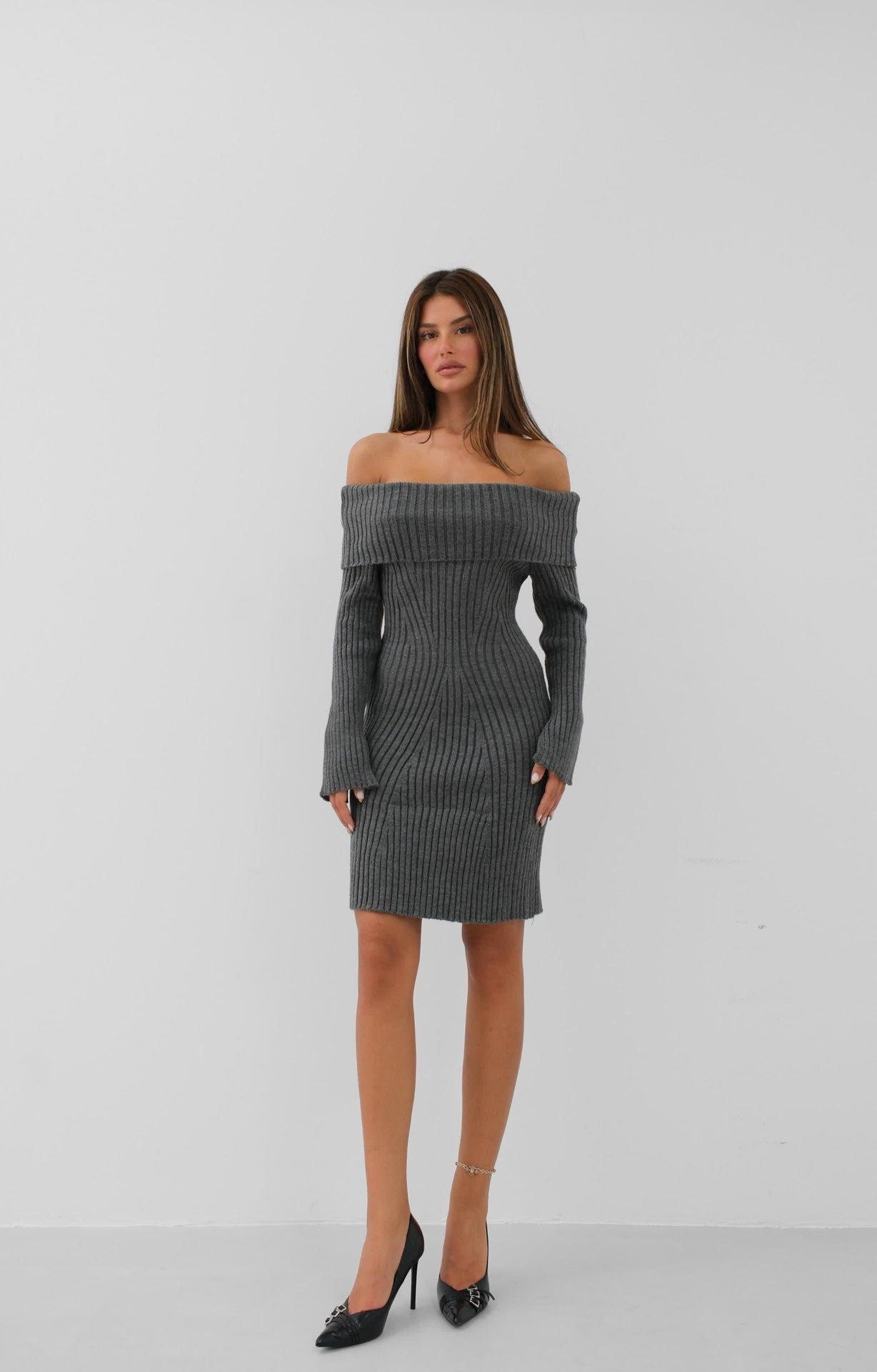 Omuz Dekolteli Midi Boy Gri Triko Elbise ()