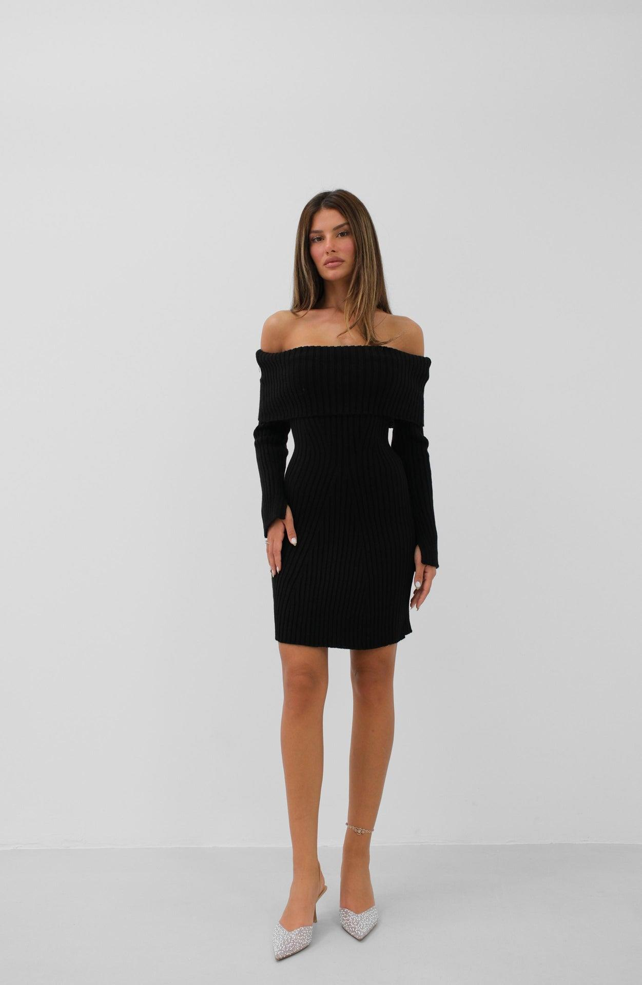 Omuz Dekolteli Midi Boy Siyah Triko Elbise