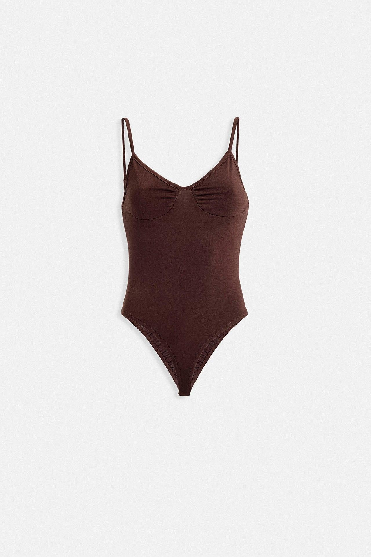 Önü Büzgülü Askılı Kahverengi Bodysuit ()