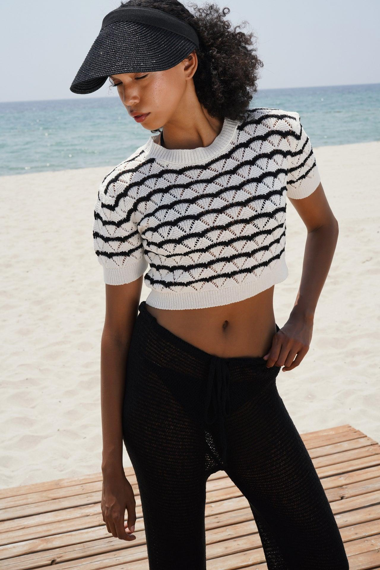 Örgü Detay Çizgili Crop Beyaz Siyah Bluz