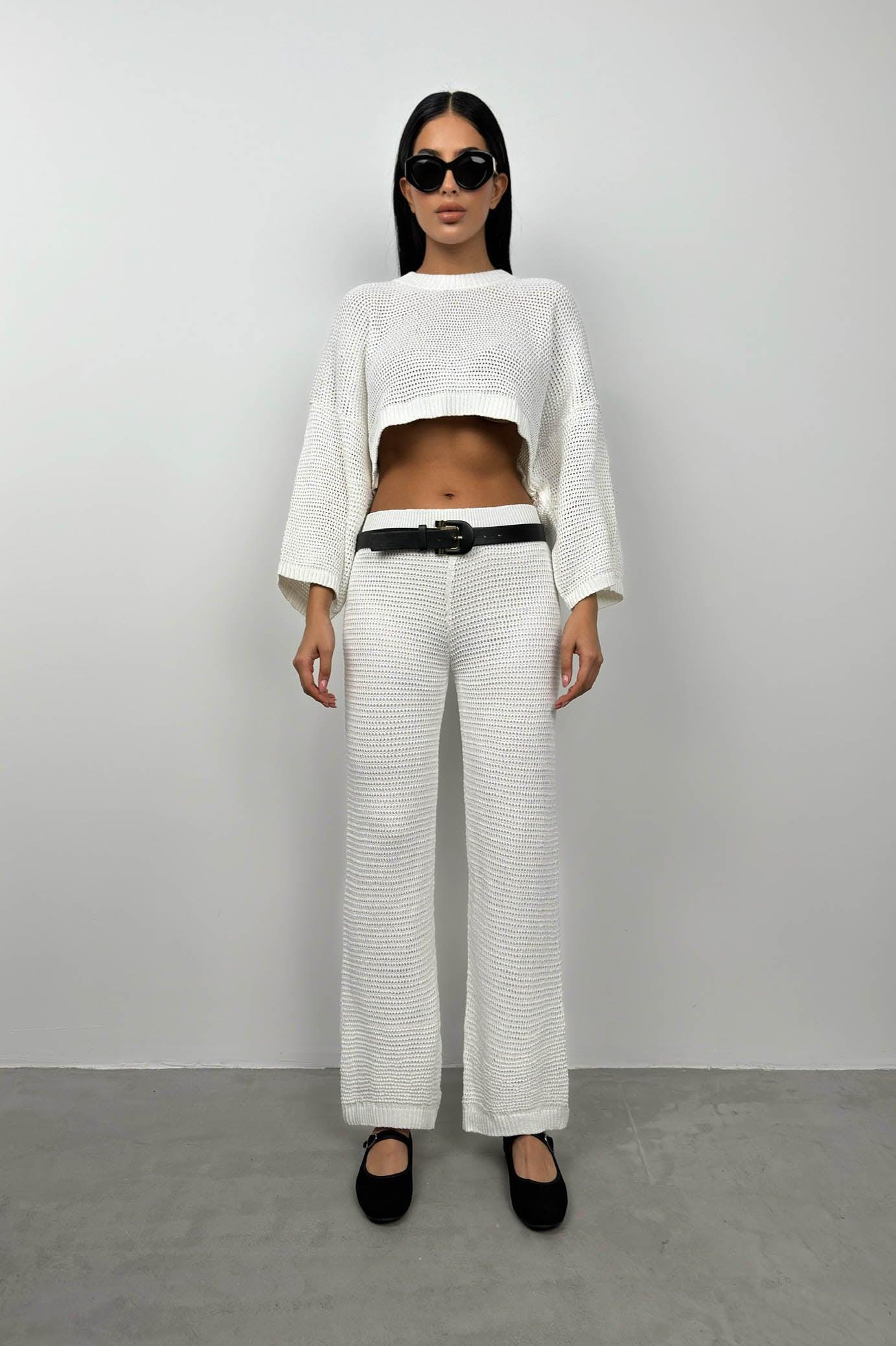 Oversize Beyaz Triko Bluz Pantolon Takım