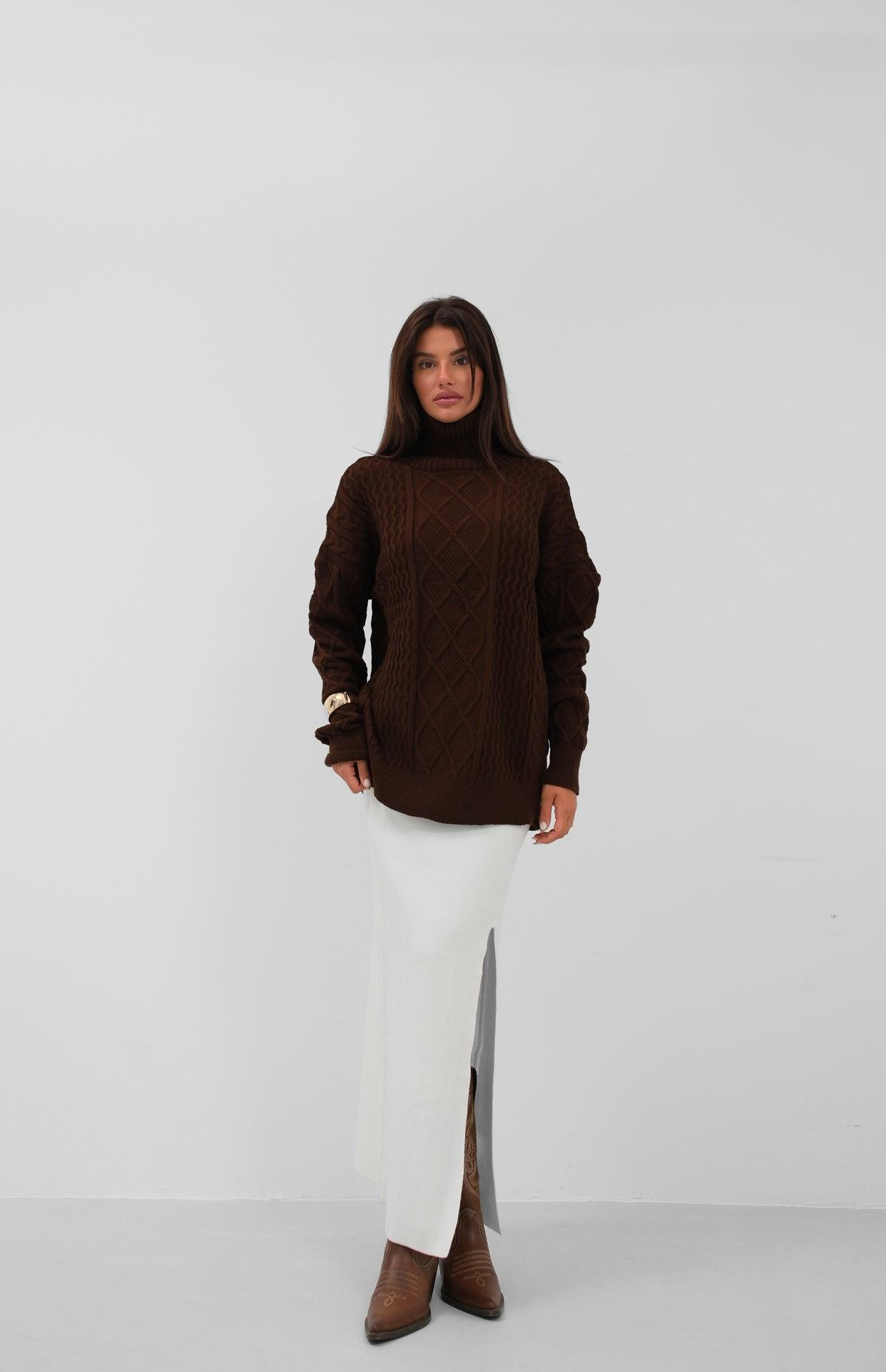 Oversize Boğazlı Kahverengi Örgü Kazak