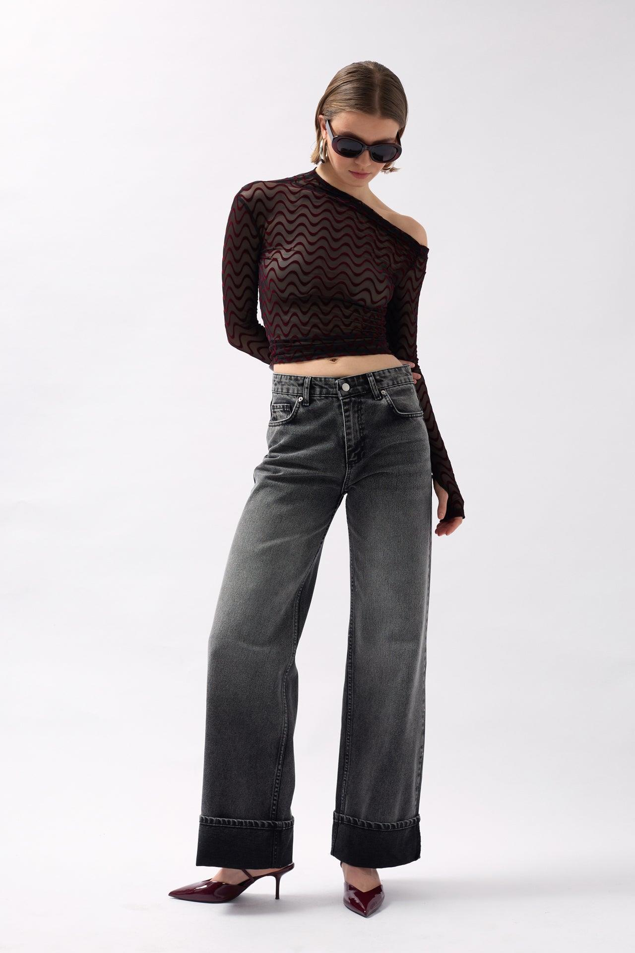 Paça Katlamalı Yüksek Bel Siyah Jean ()