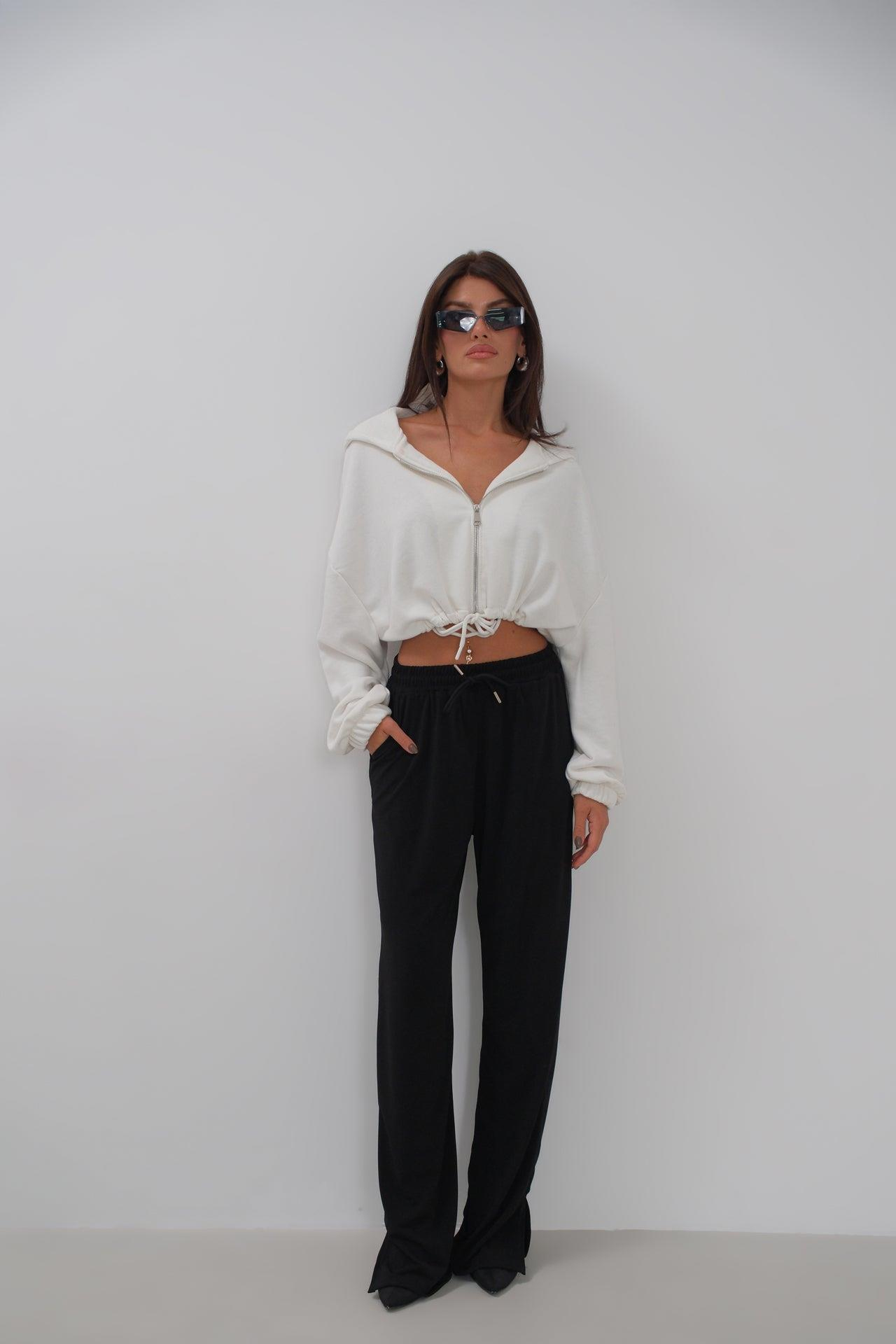 Paça Yırtmaç Detaylı Beli Lastikli Siyah Pantolon ()