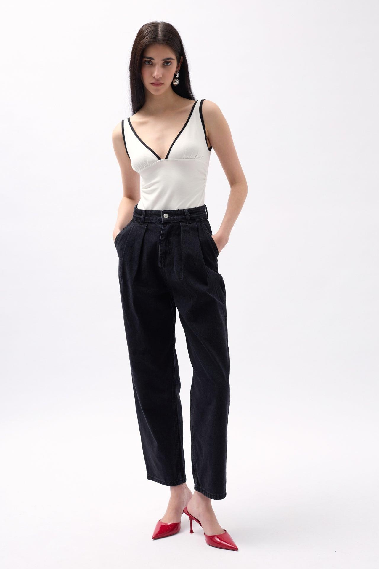 Pensli, Beş Cepli, Yüksek Bel, Mom Jean, İspanyol Paça, Önü Fermuarlı, Metal Düğmeli Manken Ölçüleri : Göğüs : 89 cm Bel : 68 cm Basen : 95 cm Manken Boy : 177 cm Kilo : 57 kg Manken üzerindeki M bedendir. Ürün İçeriği : 100 Pamuk Ürün Kodu : 23S05005