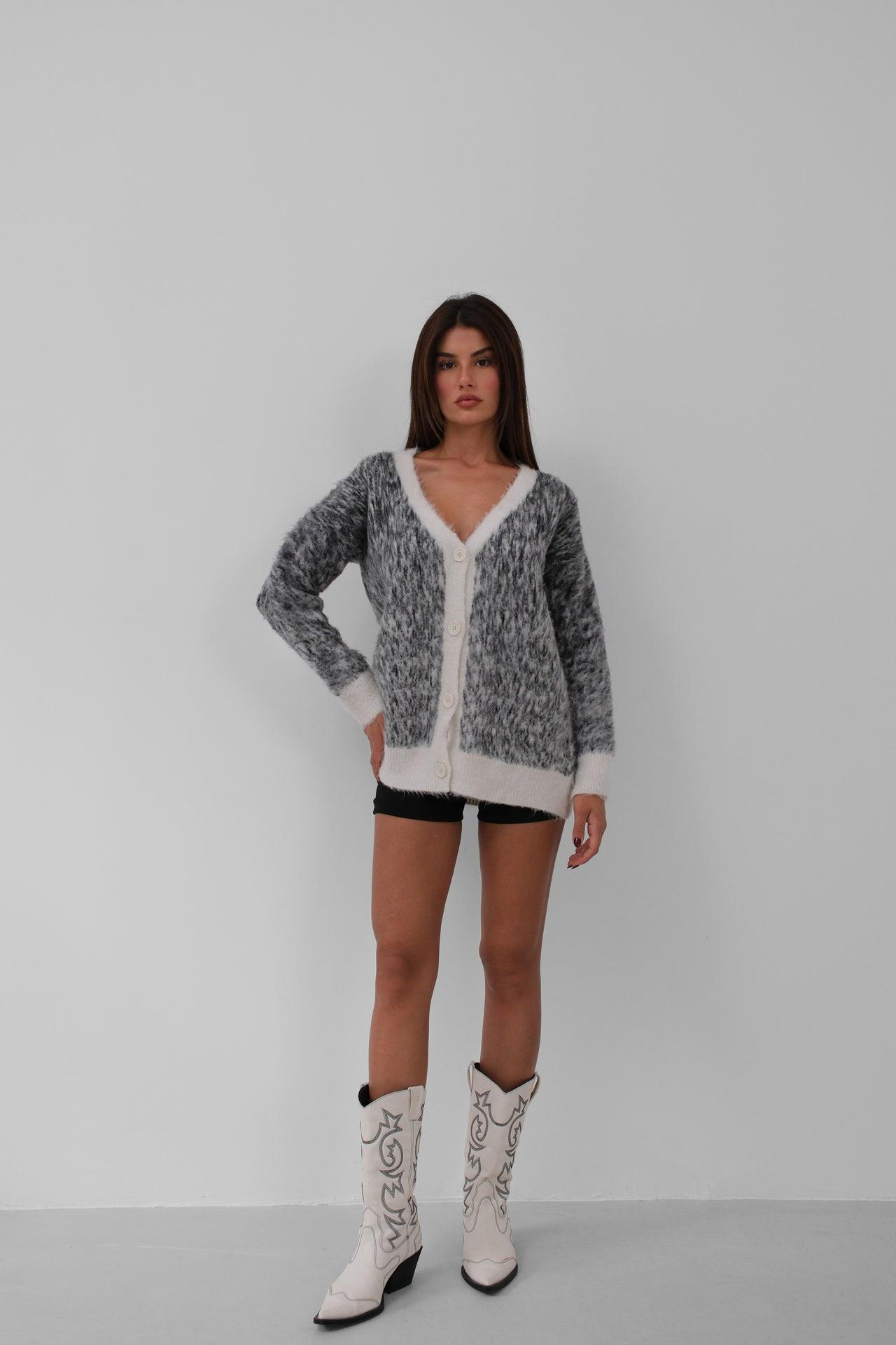 Sakallı Kontrast Renkli Açık Gri Triko Hırka