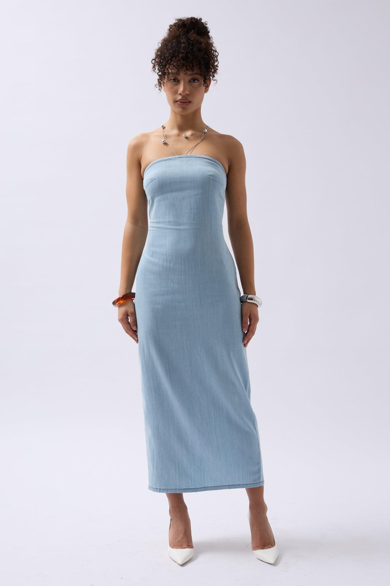Straplez Denim Maxi Açık Mavi Elbise ()