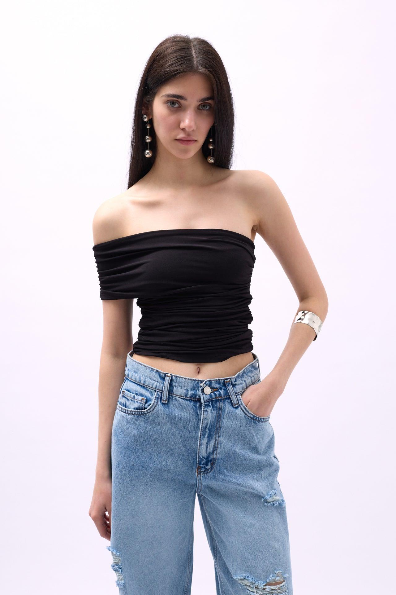 Tek Omuz Büzgülü Siyah Bluz ()