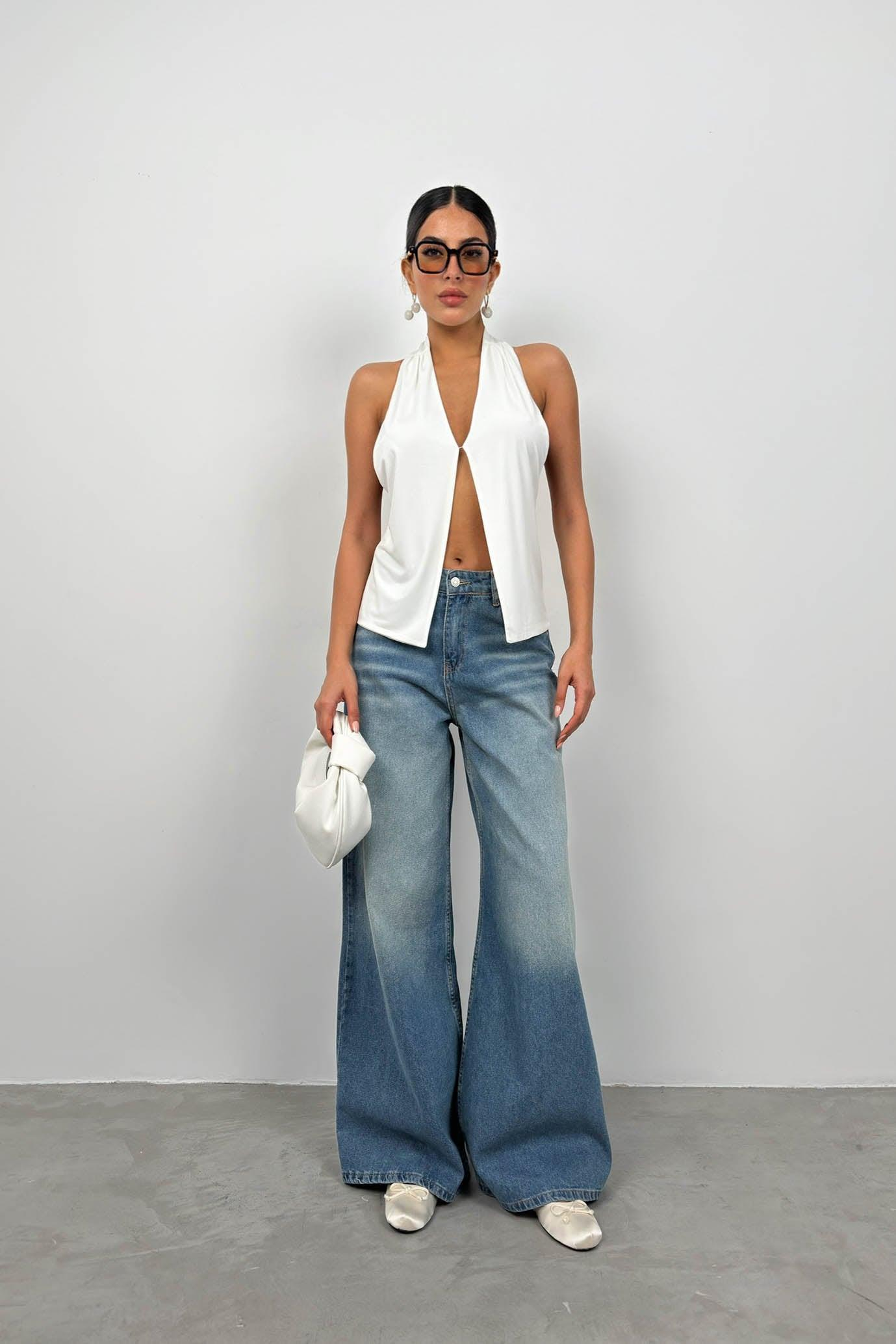 V Yaka Sırt Dekolte Ekru Bluz ()