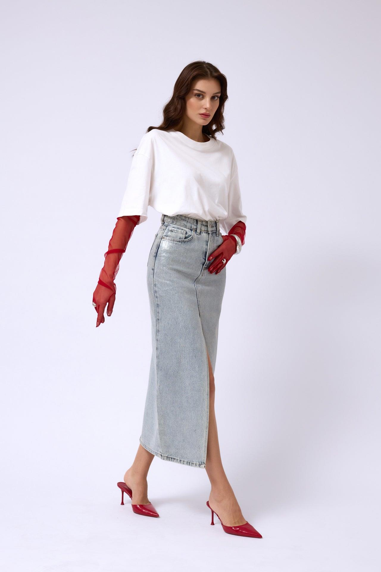 Varak Baskılı Yırtmaçlı Mavi Maxi Kot Etek