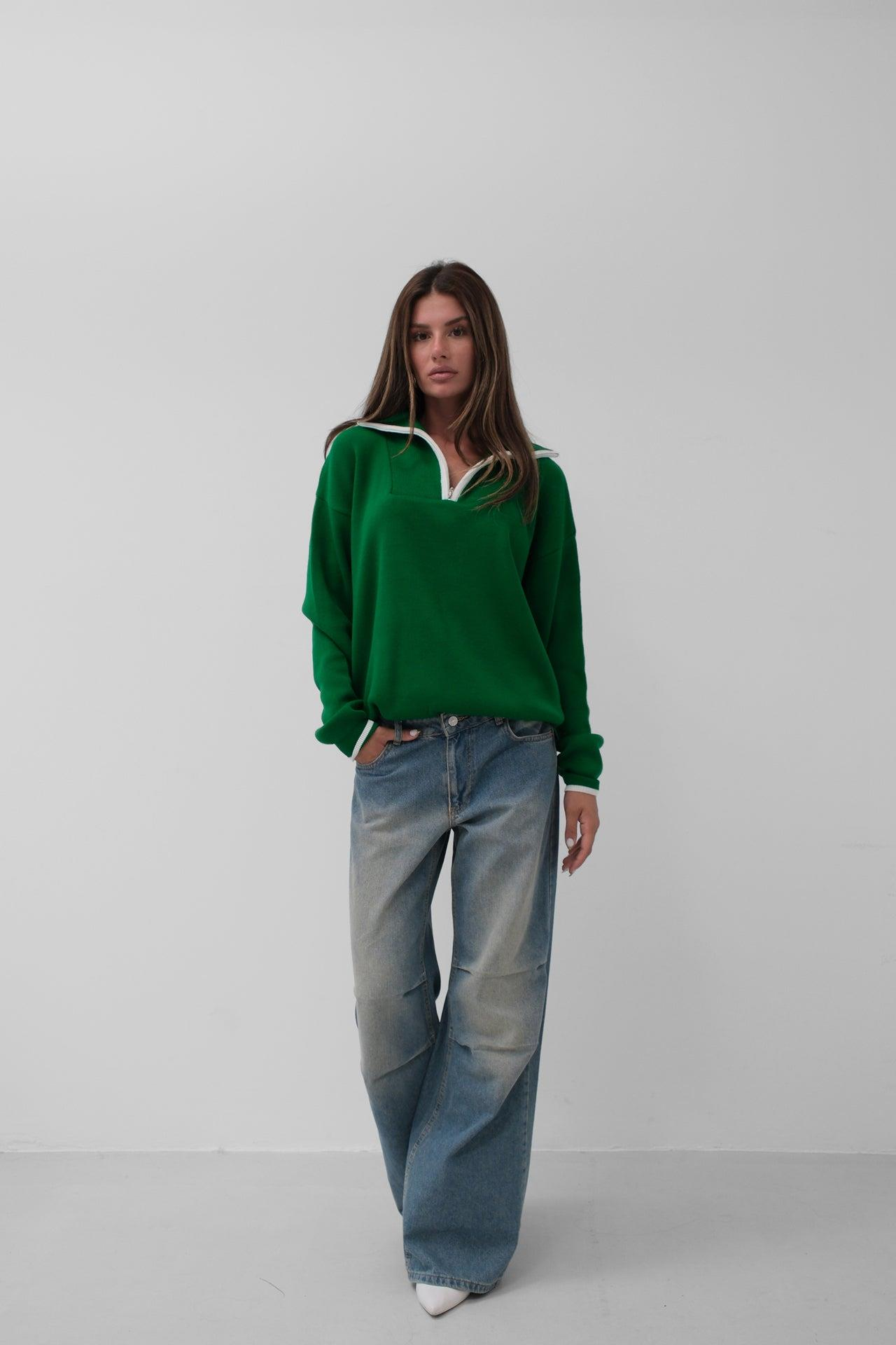 Yaka Fermuar Detay Yeşil Oversize Kazak