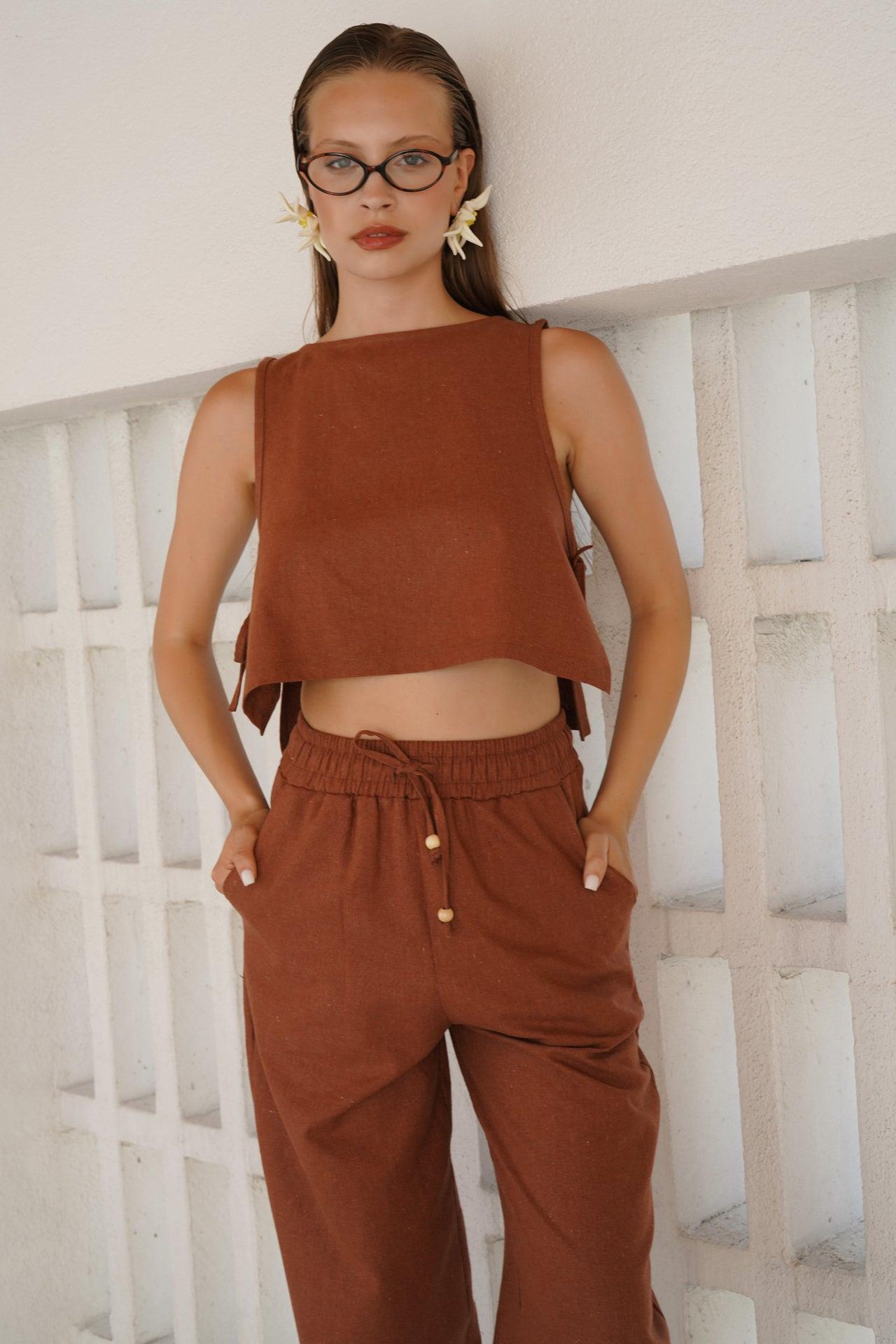 Yandan Bağlamalı Crop Kahverengi Bluz