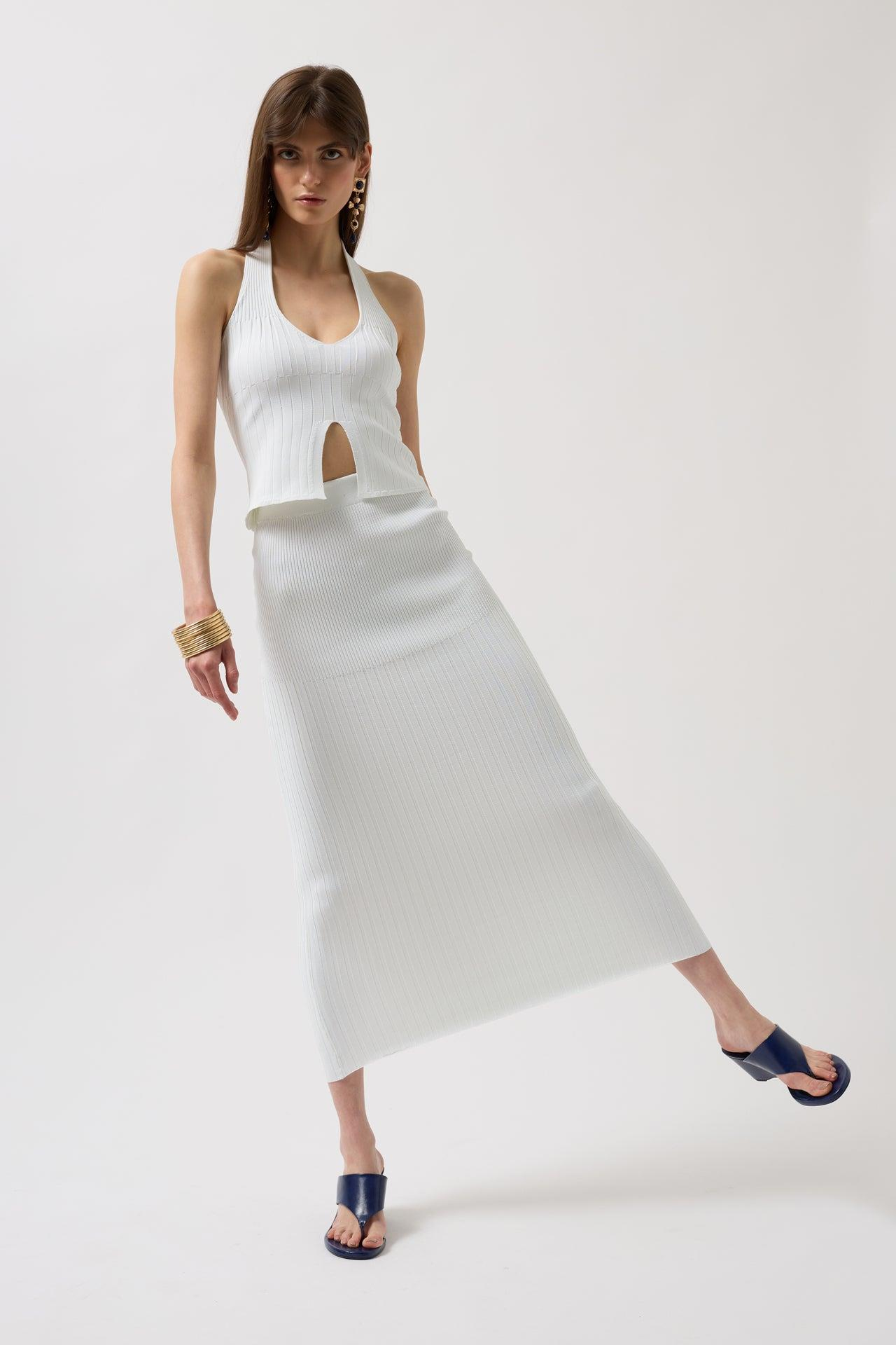 Yüksek Bel Dokulu Beyaz Etek