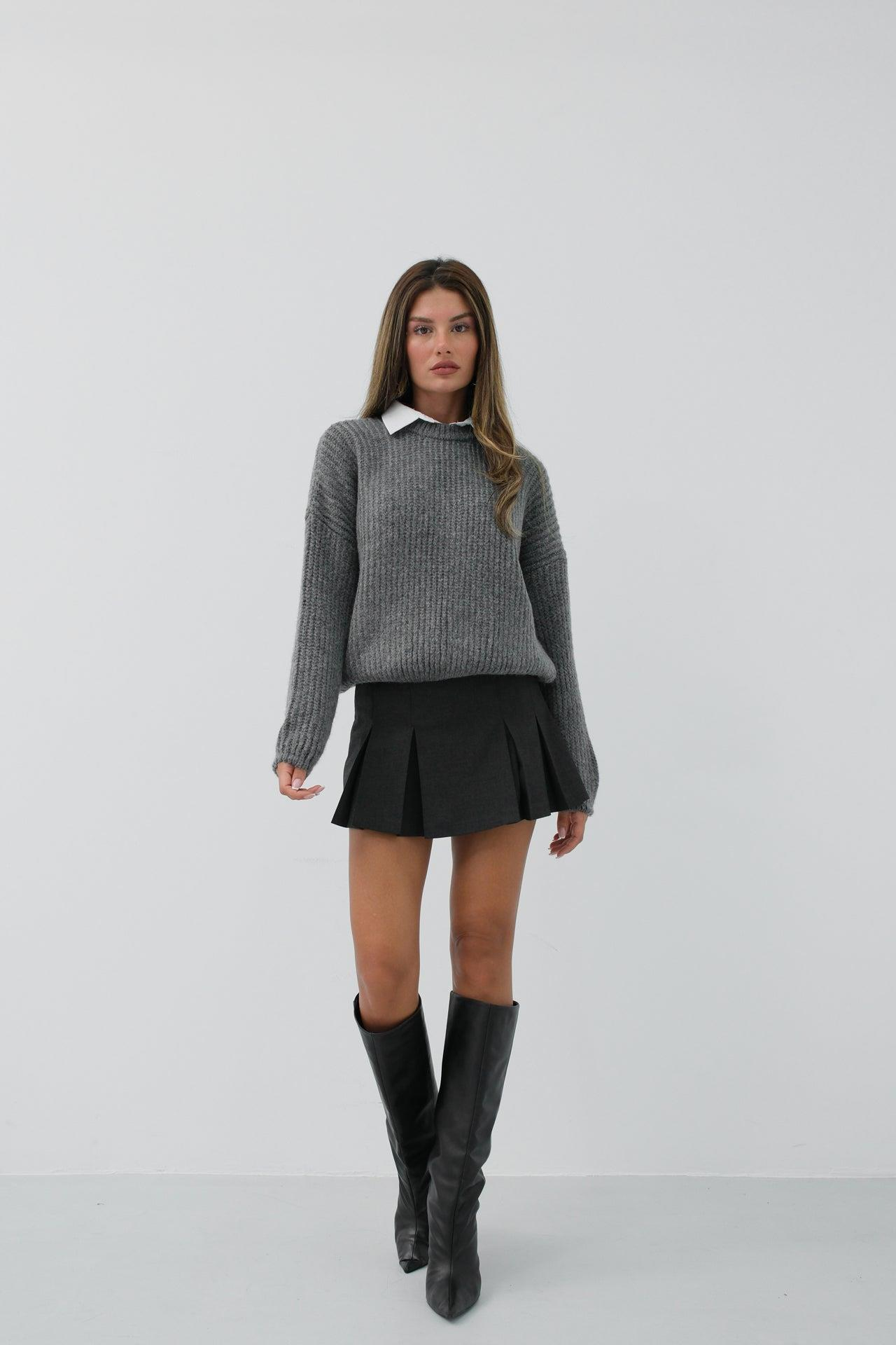 Yuvarlak Yakalı Gri Oversize Triko Gri Kazak ()